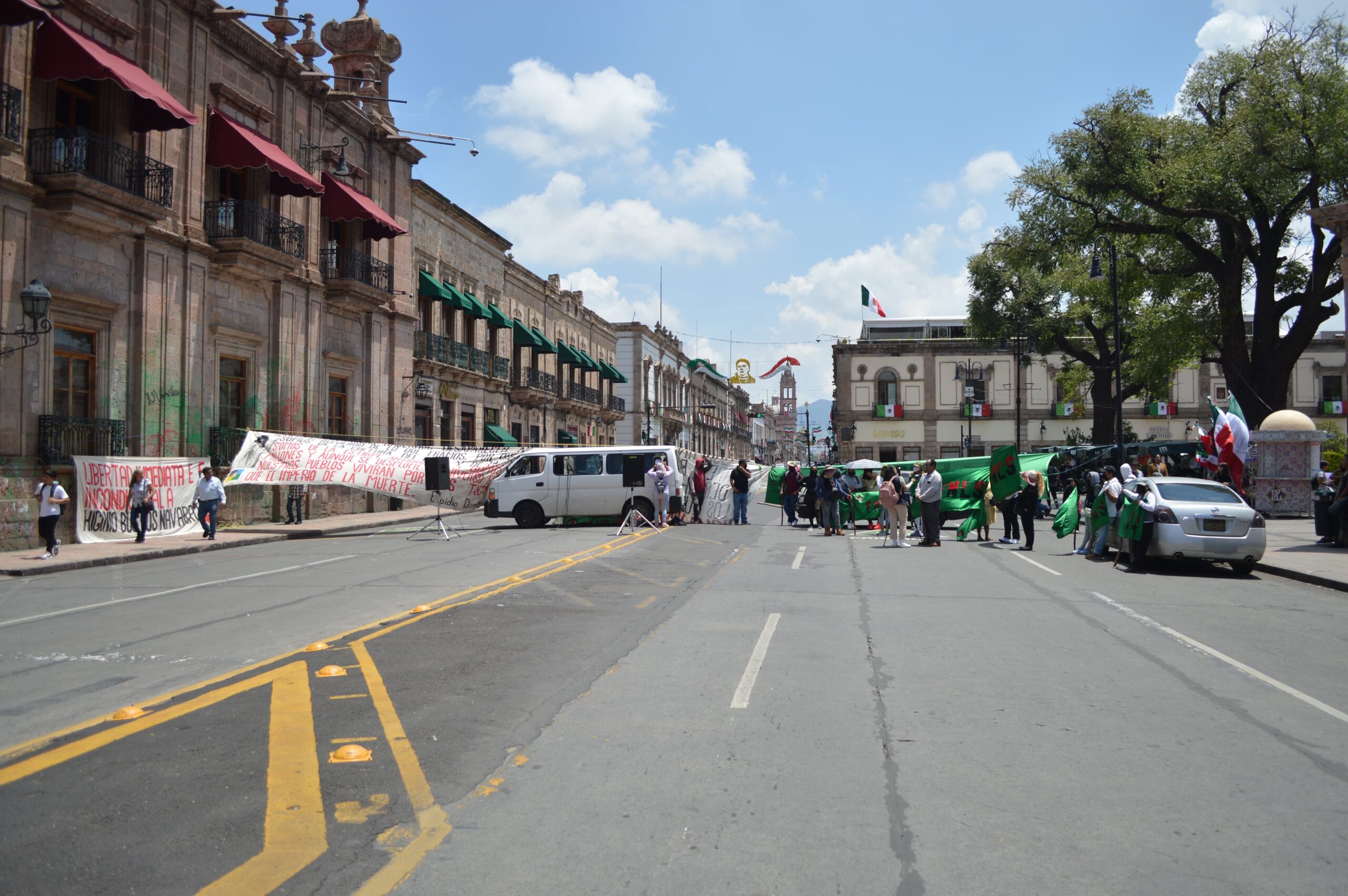 Morelia, Mich. | Alberto Barrera/ACG.-Miembros del Frente Nacional de Lucha por el Sindicalismo (FNLS), se manifiestan frente al palacio de Gobierno para denunciar la persecución política de la 4T a integrantes de la organización.