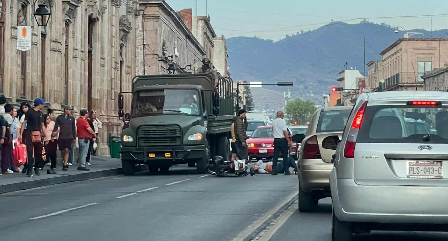 Morelia, Mich.- Viernes 13 de febrero de 2026.- Tres jóvenes resultaron lesionados durante un accidente de motocicleta registrado en el Centro Histórico de la ciudad de Morelia, informaron fuentes allegadas al tema.