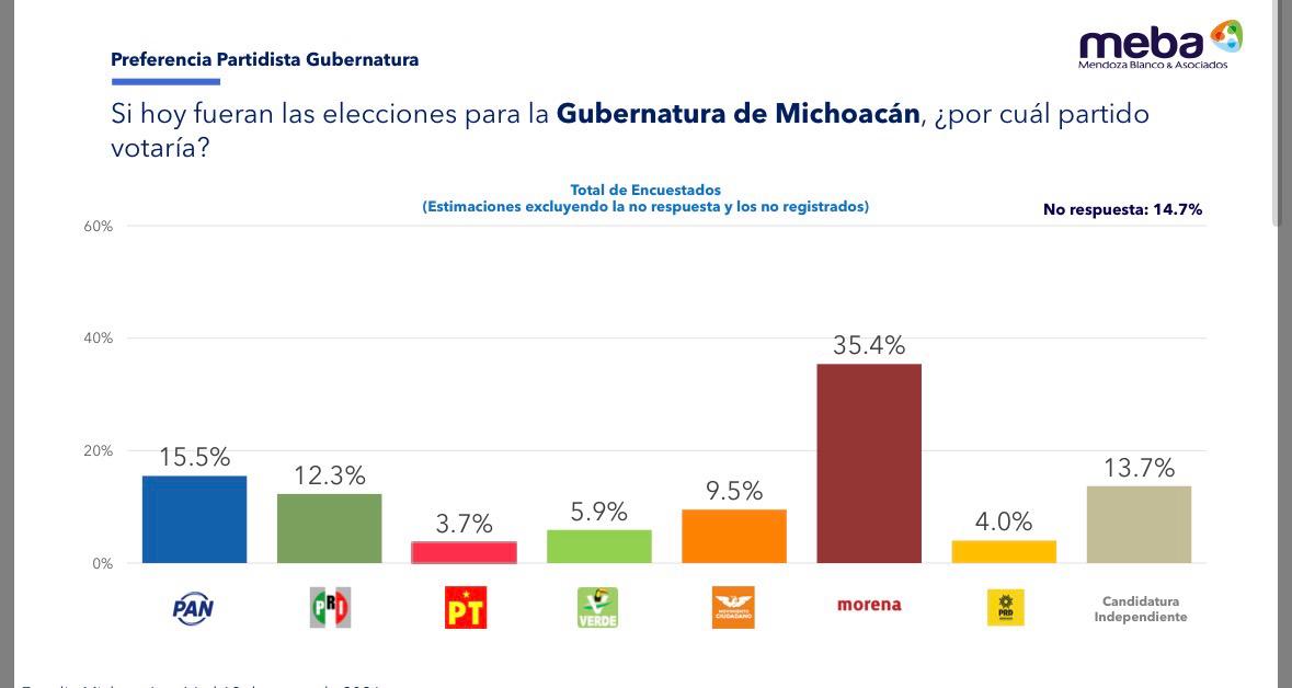 Si hoy fueran las elecciones para la Gubernatura de Michoacán, ¿por quién votaría?, en este rubro no solo se incluye a los aspirantes morenistas, sino también a sus principales pares opositores, aunque se excluye a la no respuesta y los no registrados: