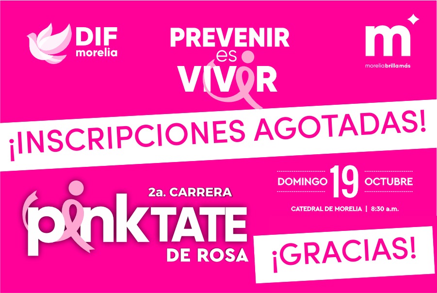 Morelia, Michoacán; 17 de octubre de 2025.– La presidenta honoraria del DIF Morelia, Paola Delgadillo Hernández, anunció que las inscripciones para la Segunda Carrera Atlética “Pinktate de Rosa” han quedado agotadas, gracias a la entusiasta respuesta de la ciudadanía que se ha sumado a esta causa solidaria en apoyo a mujeres que han superado o enfrentan el cáncer de mama.