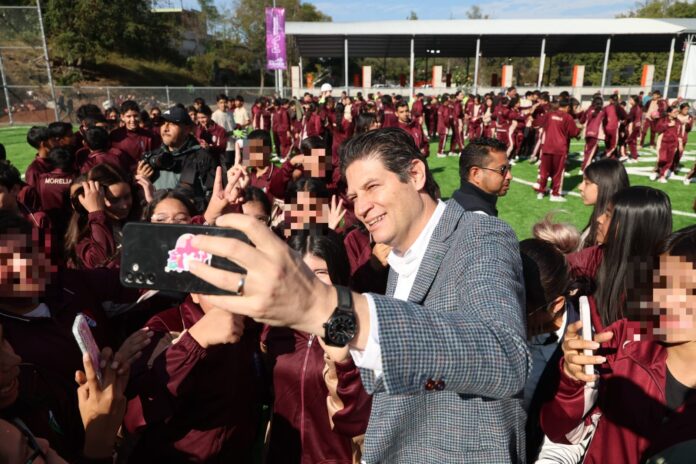 Morelia, Michoacán; 10 de diciembre de 2025.- El deporte es una de las principales actividades para construir la paz e impulsar a los jóvenes, refrendó el presidente municipal de Morelia, Alfonso Martínez Alcázar, al asistir a la inauguración de las canchas de Fútbol 7 en la Escuela Secundaria Federal Número 2 “Hermanos Flores Magón”.