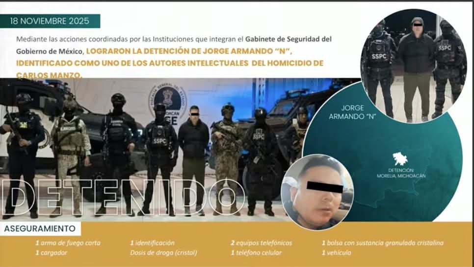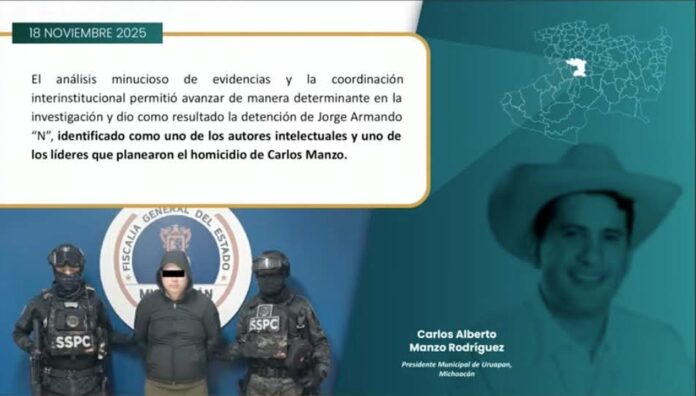 Morelia, Mich..- La colaboración entre la Secretaría de Seguridad y Protección Ciudadana de México y la Fiscalía General de Michoacán culminó en un operativo que logró la detención de Jorge Armando «N,» alias «El Licenciado,» identificado como uno de los autores intelectuales y líder de la célula criminal ligada al Cártel de Jalisco Nueva Generación (CJNG), responsable del asesinato de Carlos Manzo el pasado 1 de noviembre, según informaron el Secretario Omar García Harfuch y el Fiscal Carlos Torres Piña en conferencia de prensa.