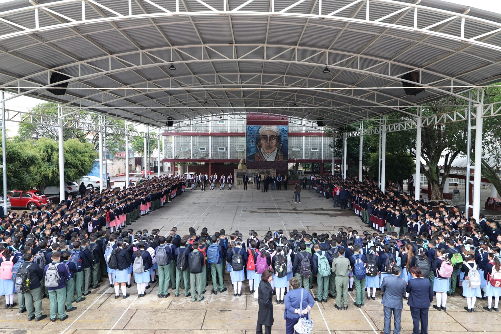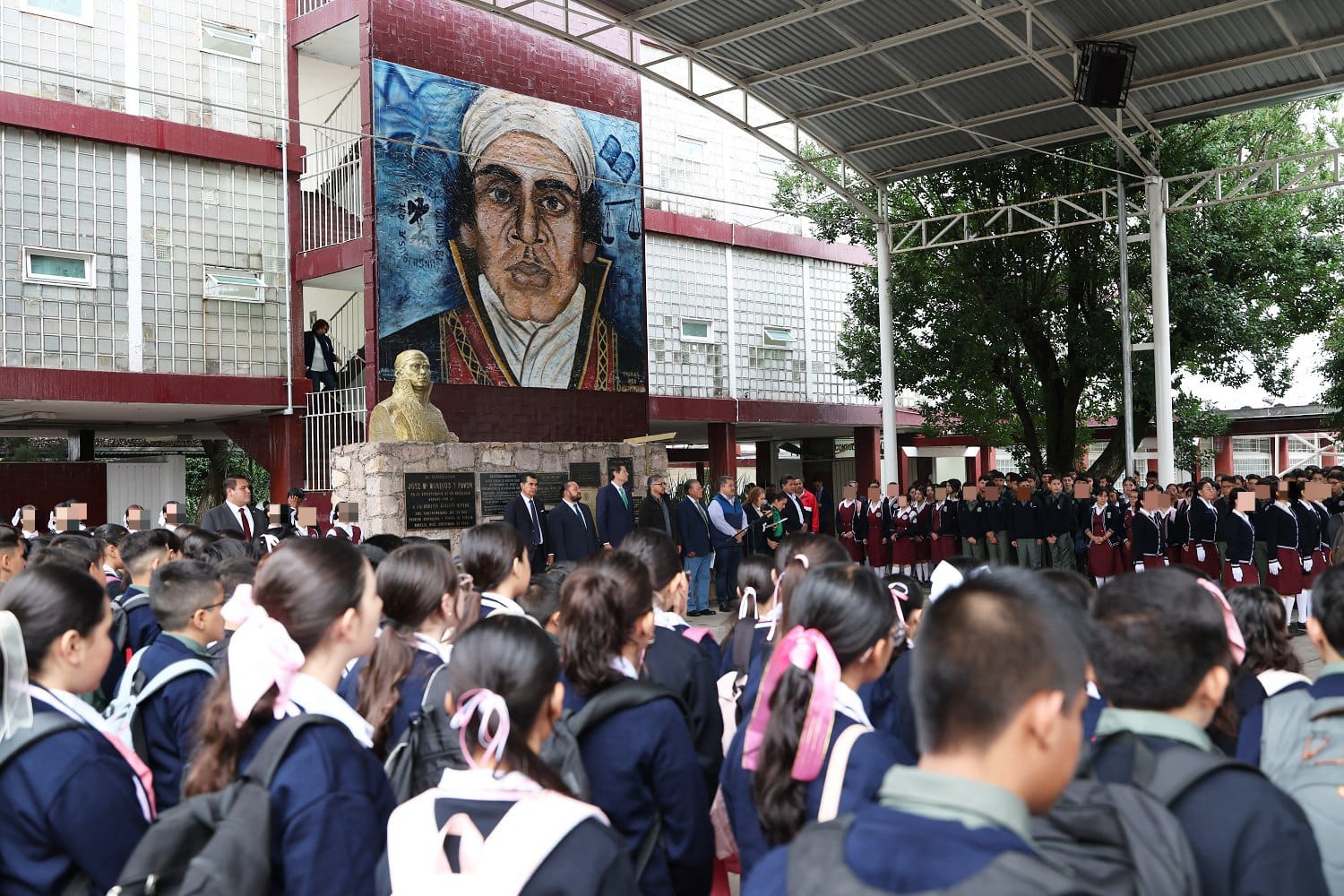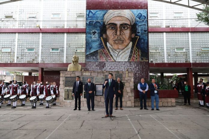 Reunidos en el patio principal de la Escuela Secundaria Federal no. 1 «José María Morelos y Pavón», el alcalde encabezó la ceremonia cívica, acompañado del director, Ariel Rodríguez Esquivel, cientos de jóvenes, así como personal docente y administrativo de la institución.