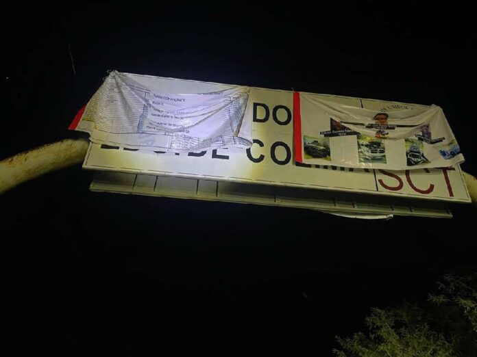 Coahuayana, Mich.- 27 de diciembre de 2025.- Varias narcomantas fueron localizadas colgadas en el arco del puente Coahuayana, mismo que divide a los estados de Michoacán y Colima.