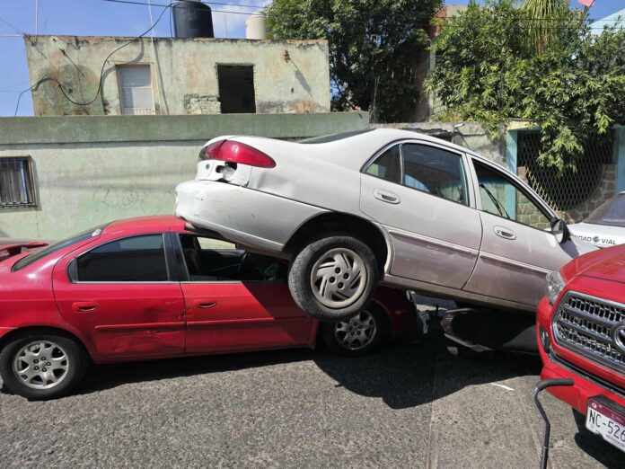 Morelia, Mich.- Viernes 30 de enero de 2026.- Un adulto mayor, a bordo de su automóvil, arrancó en reversa, embistió a un motociclista y su unidad terminó arriba de otro automotor; además, en la maniobra, dañó el costado derecho de una camioneta. En el incidente resultaron heridos el motorista y el hombre de la tercera edad, trascendió en la cobertura de la noticia.