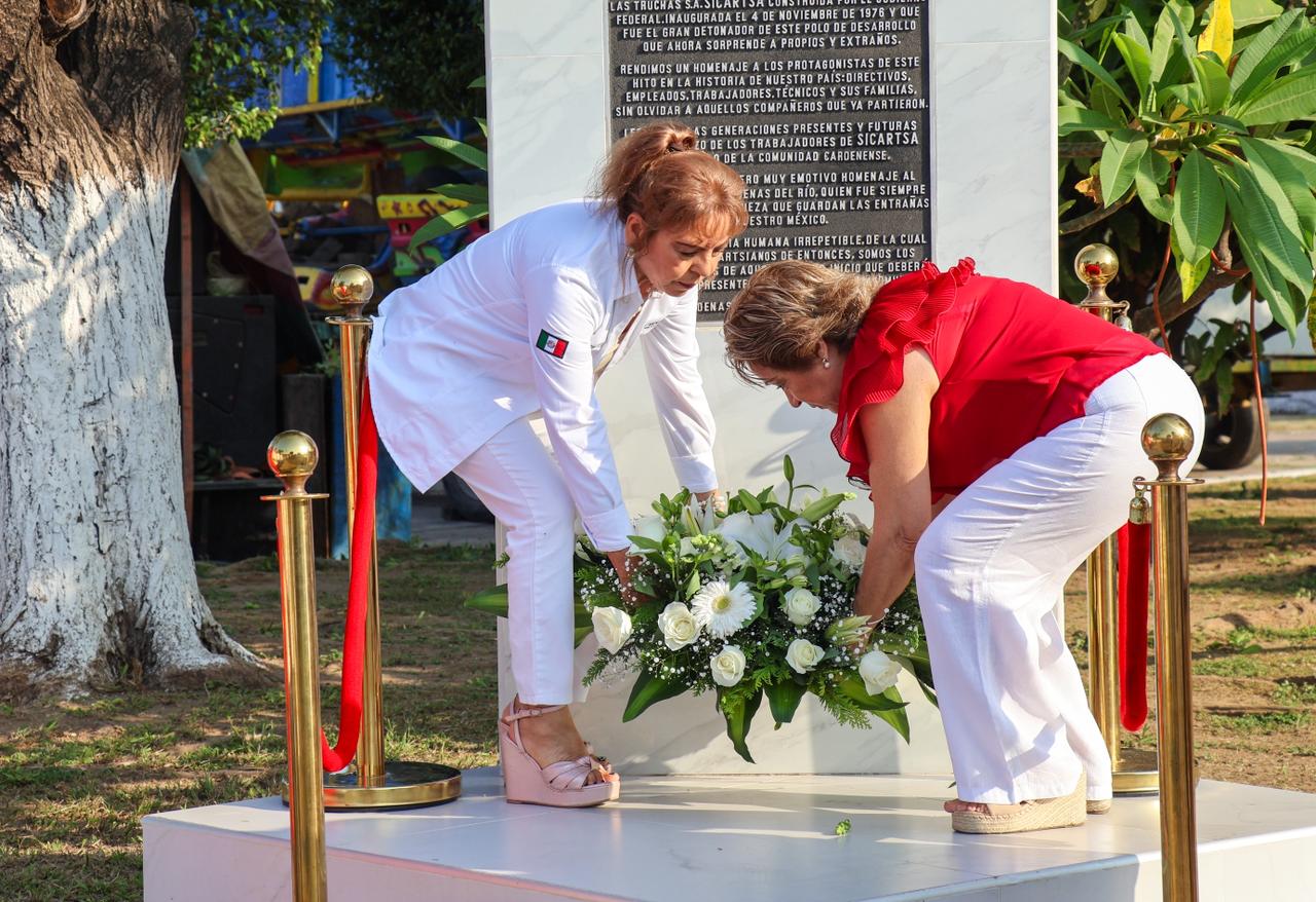 Por su parte, la Lic. Consuelo Arreola Belgara compartió con los asistentes una obra del escritor Gerardo Fuentes, michoacano originario de Arteaga, y que formó parte de la construcción de Sicartsa; asimismo convocó a realizar un minuto de aplausos por todos los trabajadores, ingenieros y colabores de Sicartsa que hoy ya no se encuentran con nosotros. Siguiendo con este acto, autoridades hicieron la colocación de una ofrenda floral en la placa conmemorativa de esta fecha, así como en al monumento al general Lázaro Cárdenas; y con ello concluir esta significativa y simbólica ceremonia.