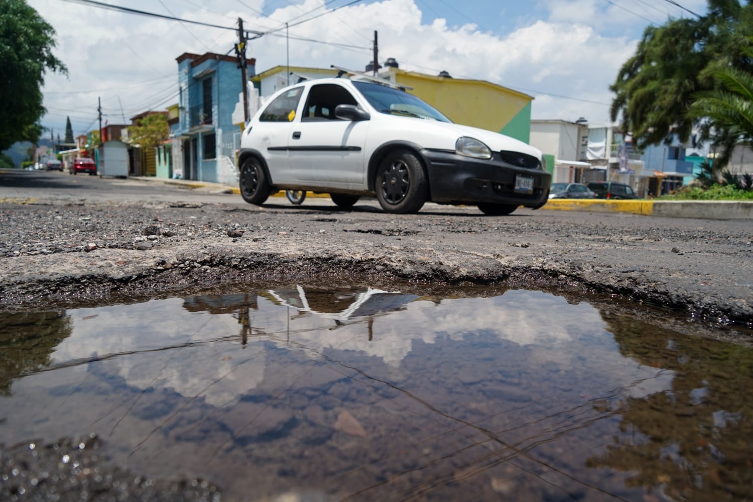 En la calle 15 de Octubre resaltan dos baches que están llenos de agua casi cristalina, como si fueran manantiales, y los vehículos que transitan a diario por esta vialidad tienen que esquivarlos, ya que por su tamaño podrían causar un incidente.