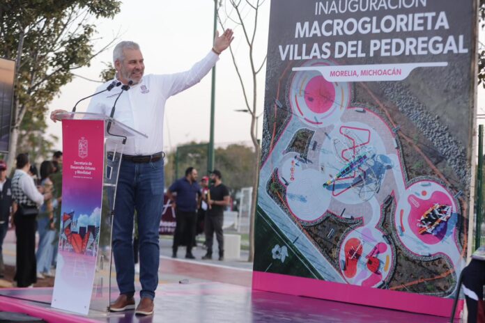 Morelia, Michoacán, 21 de noviembre de 2025.- El gobernador Alfredo Ramírez Bedolla inauguró la macroglorieta de Villas de Pedregal, la cual cuenta con una inversión 100 por ciento estatal de 20 millones de pesos para el rescate de este espacio público al poniente de Morelia.