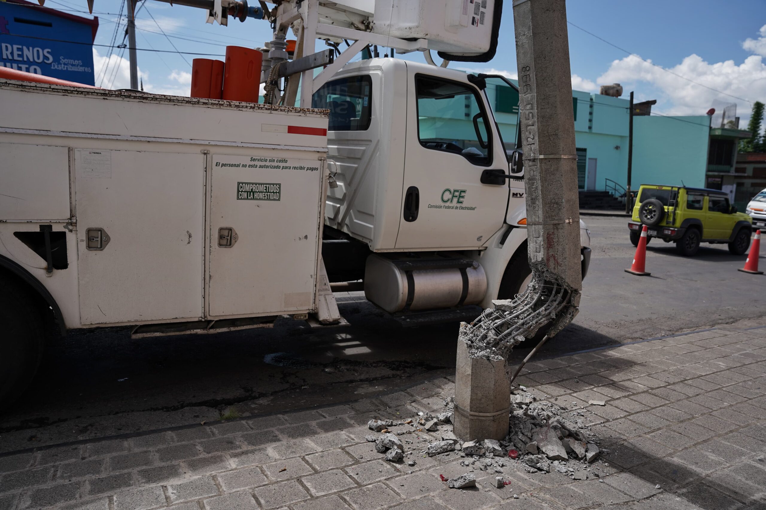 Cerca del mediodía del hoy, personal de la CFE acudió al lugar para realizar los trabajos de reparación. Los vecinos señalan que los accidentes con camiones de carga son frecuentes en la zona, ya que estos vehículos utilizan la calle Mtro. Manuel López Pérez de «Glorieta» para retornar a Salida Salamanca, lo que provocó el daño al poste cuando un camión dio marcha atrás.