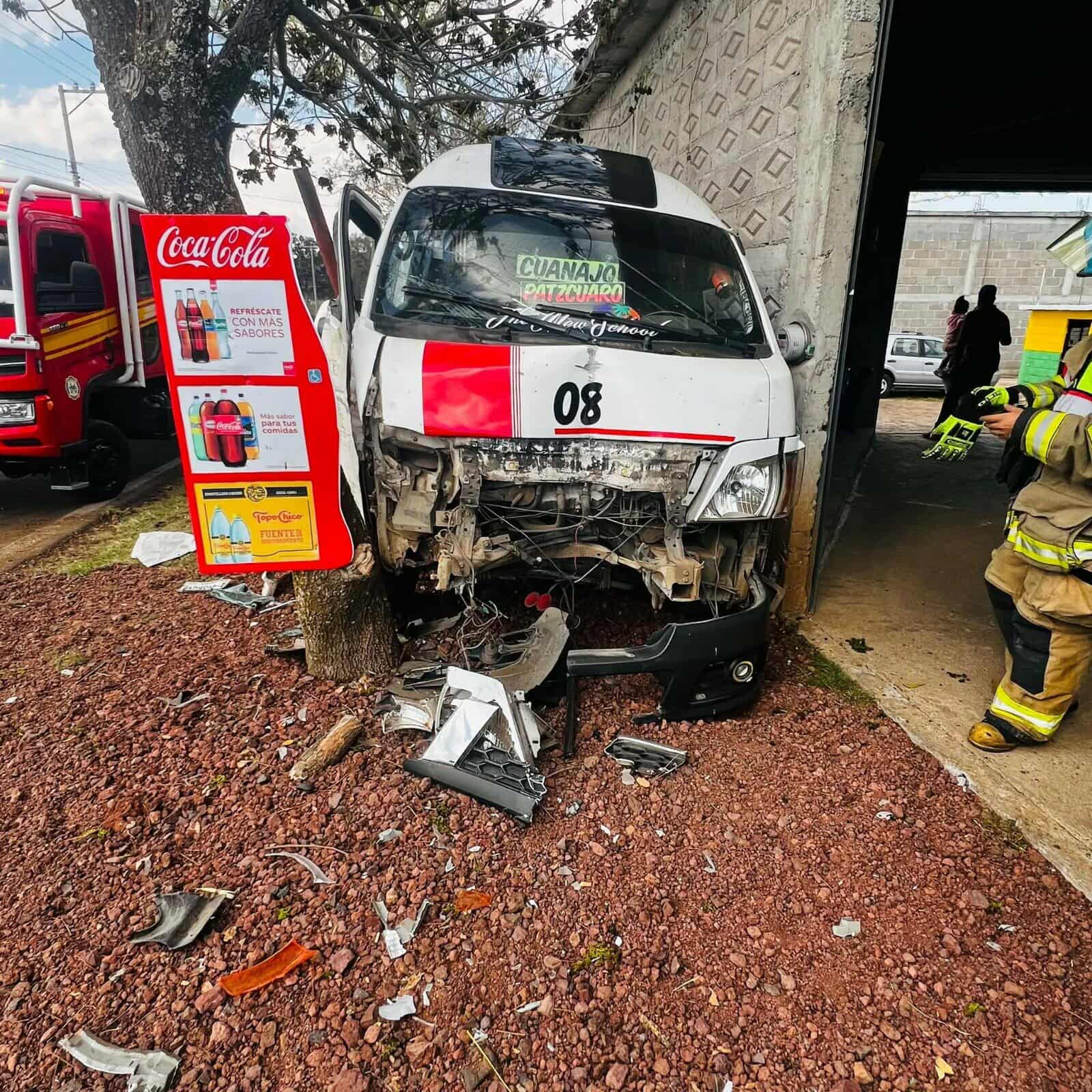 Huiramba, Mich.- Martes 10 de febrero de 2026.– Una combi de la Ruta Cuanajo chocó contra un árbol ubicado a la orilla de la carretera Pátzcuaro-Morelia. En el vehículo viajaban nueve pasajeros, pero sólo dos de ellos padecieron lesiones de consideración y requirieron traslado hospitalario, informaron fuentes de rescate.