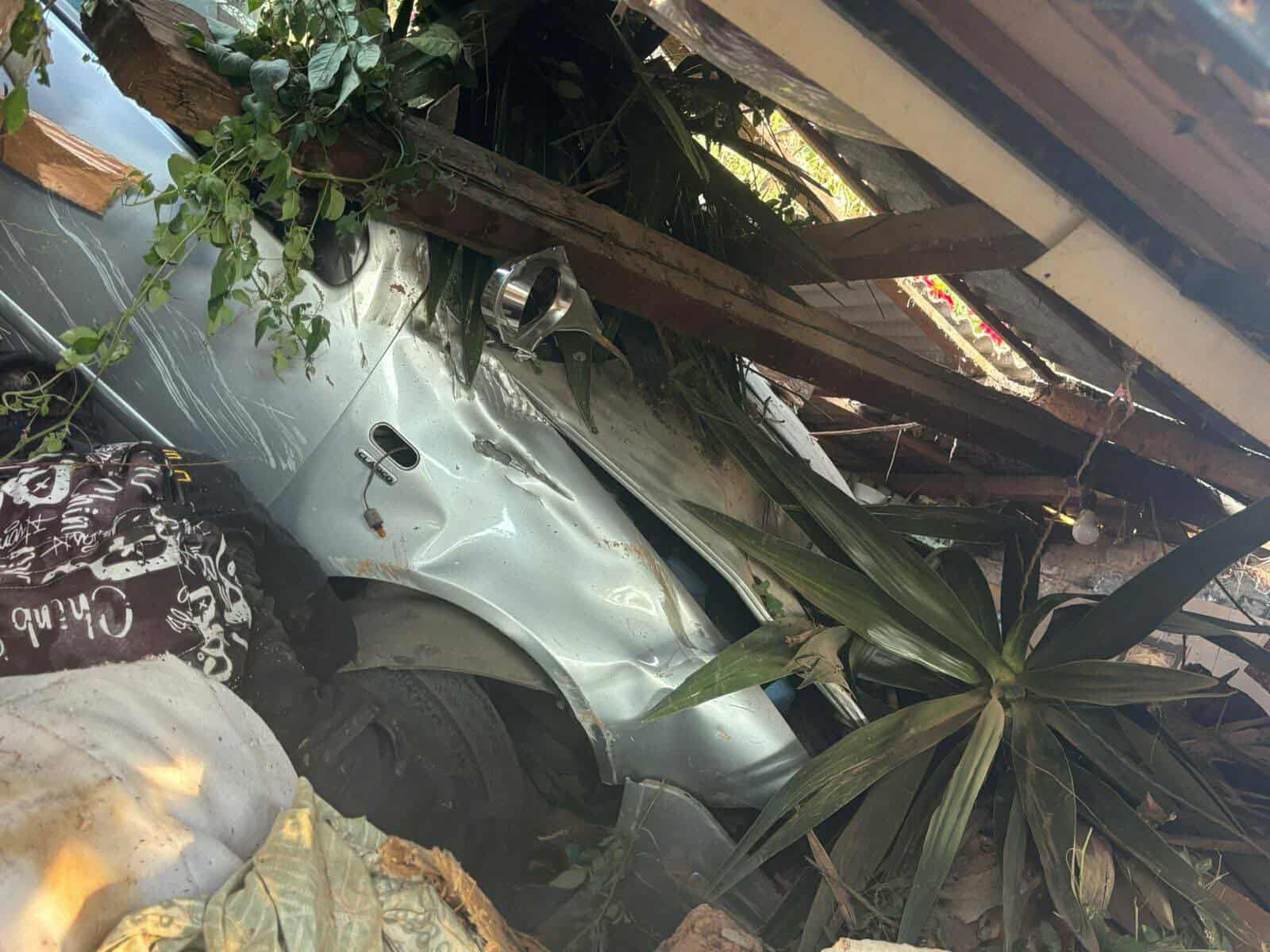 Choque con motocicleta deja auto en techo de vivienda