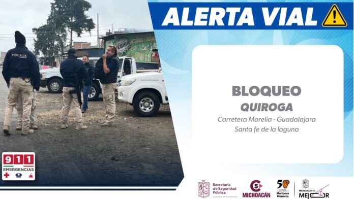 Morelia, Michoacán | Redacción. – A través de un comunicado por parte del C5 Michoacán en redes sociales, se reporta bloqueo de la circulación en la carretera Morelia-Guadalajara, a las cercanías de Santa Fe de la Laguna en Quiroga, se recomienda tomar precauciones y vías alternas.
