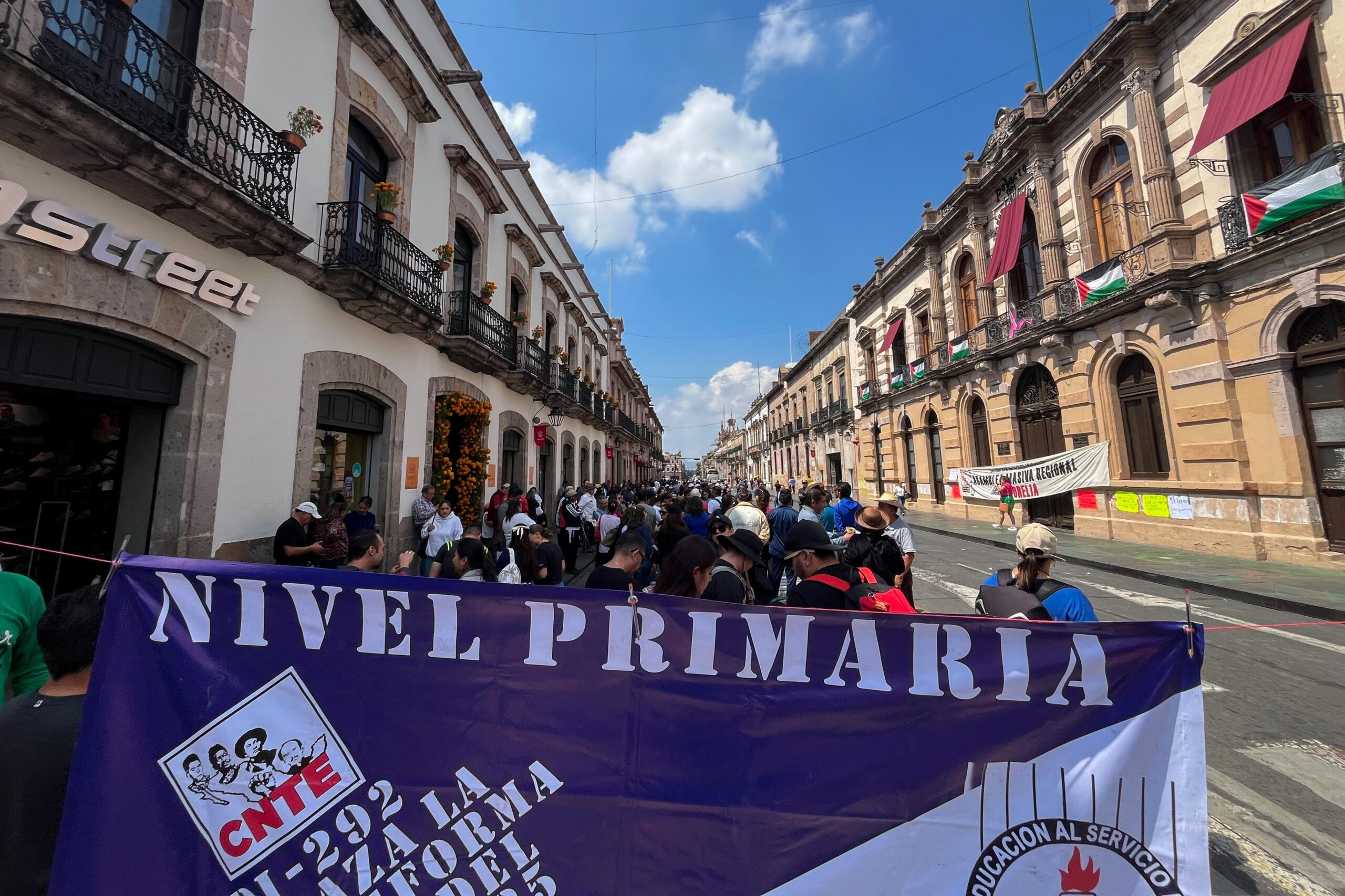 Morelia, MIchoacán | Redacción ACG.-Integrantes de la Sección XVIII de la Coordinadora Nacional de Trabajadores de la Educación (CNTE) mantienen bloqueada la avenida Madero, frente al Congreso del Estado, como parte del paro nacional de 24 horas convocado este viernes. Los docentes, exigen la instalación de una mesa de diálogo con la presidenta Claudia Sheinbaum Pardo, así como la atención a demandas relacionadas con el ISSSTE, la USICAMM y el incremento salarial.