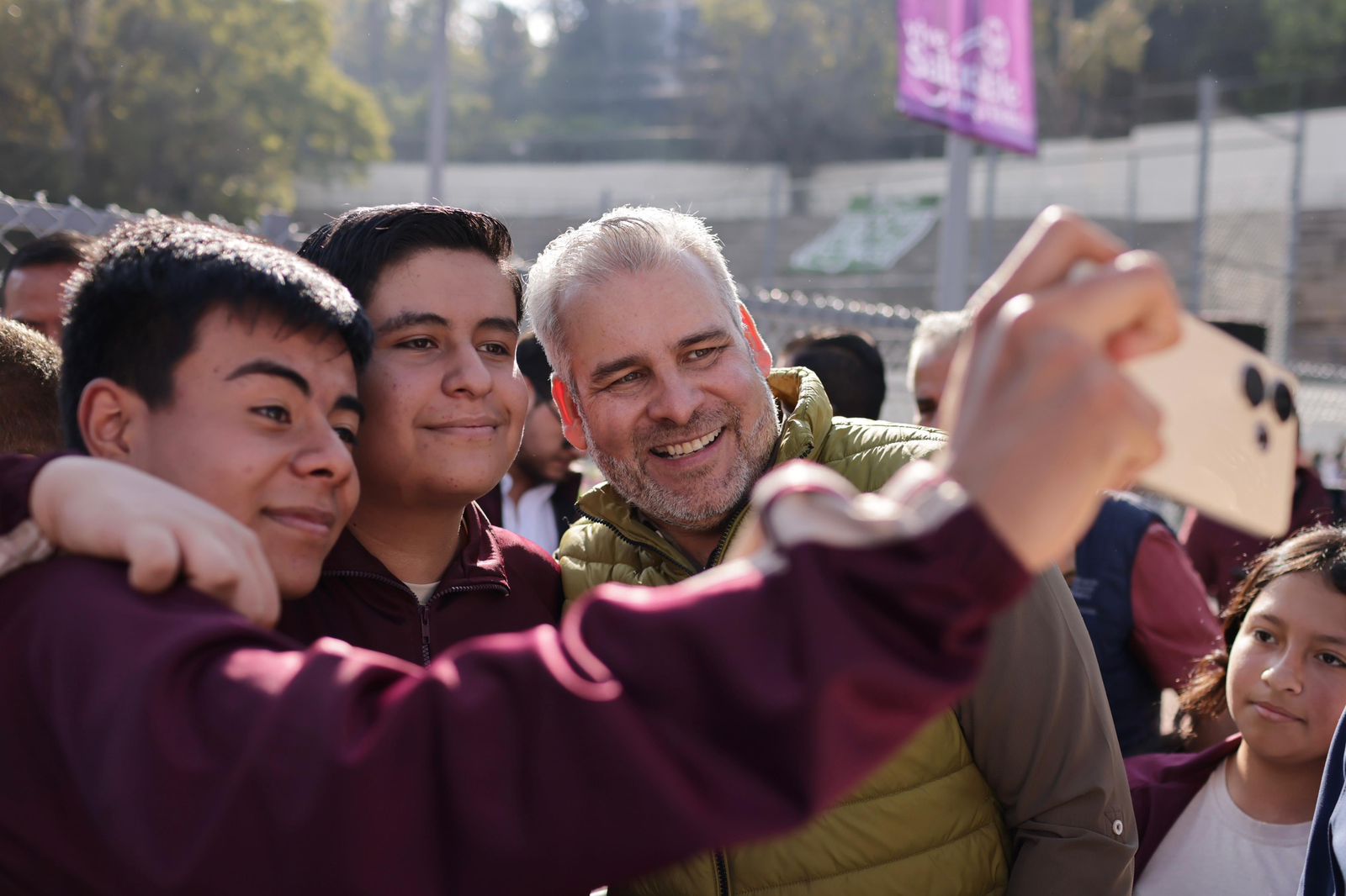 Morelia, Michoacán, 10 de diciembre de 2025.- Para impactar de manera positiva en el desarrollo físico, social, emocional y académico de las y los estudiantes, el gobernador Alfredo Ramírez Bedolla dio la patada inaugural de dos canchas de fútbol 7 en la Escuela Secundaria Federal No. 2 “Hermanos Flores Magón”.