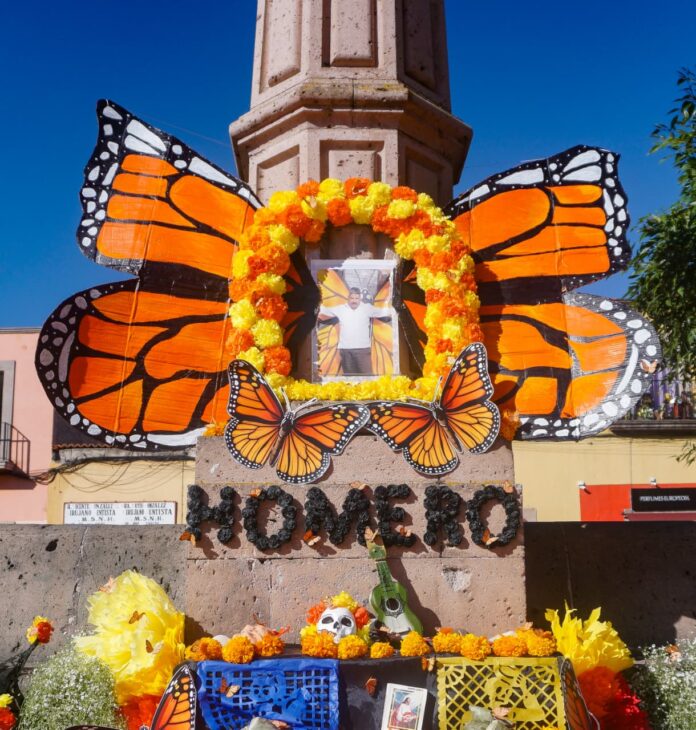 Además, un altar dedicado al activista ambiental Homero Gómez González rinde homenaje a su incansable labor en la protección de la mariposa monarca. La ofrenda resalta por las alas de mariposa que la enmarcan, símbolo de esperanza y transformación.