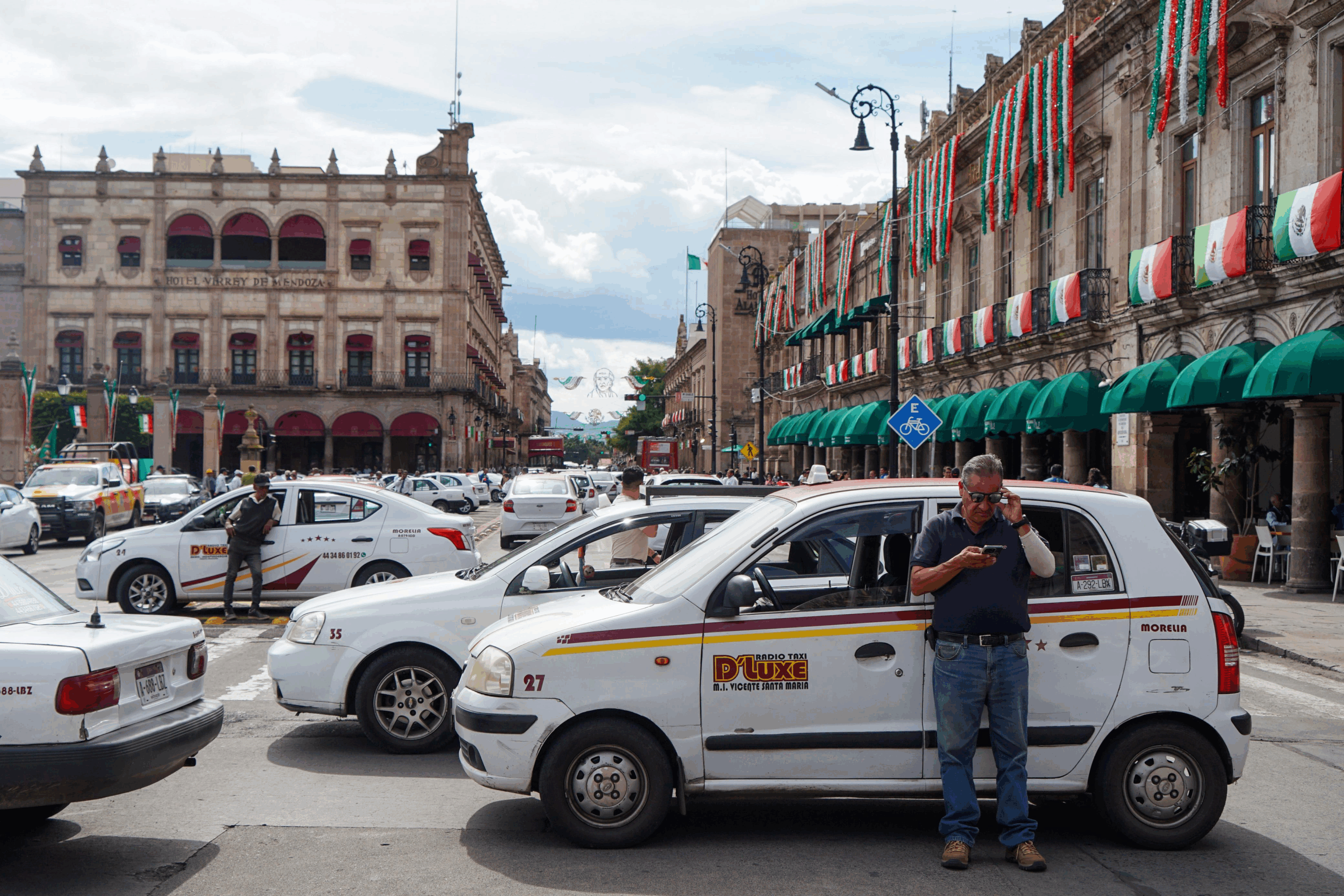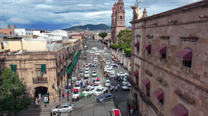 Morelia, Mich. | Félix Madrigal/ACG.- El Centro Histórico de Morelia se vio nuevamente afectado este martes por un bloqueo protagonizado por dos agrupaciones de taxistas que mantienen una disputa por el uso de una base en Avenida Madero, frente a Catedral.