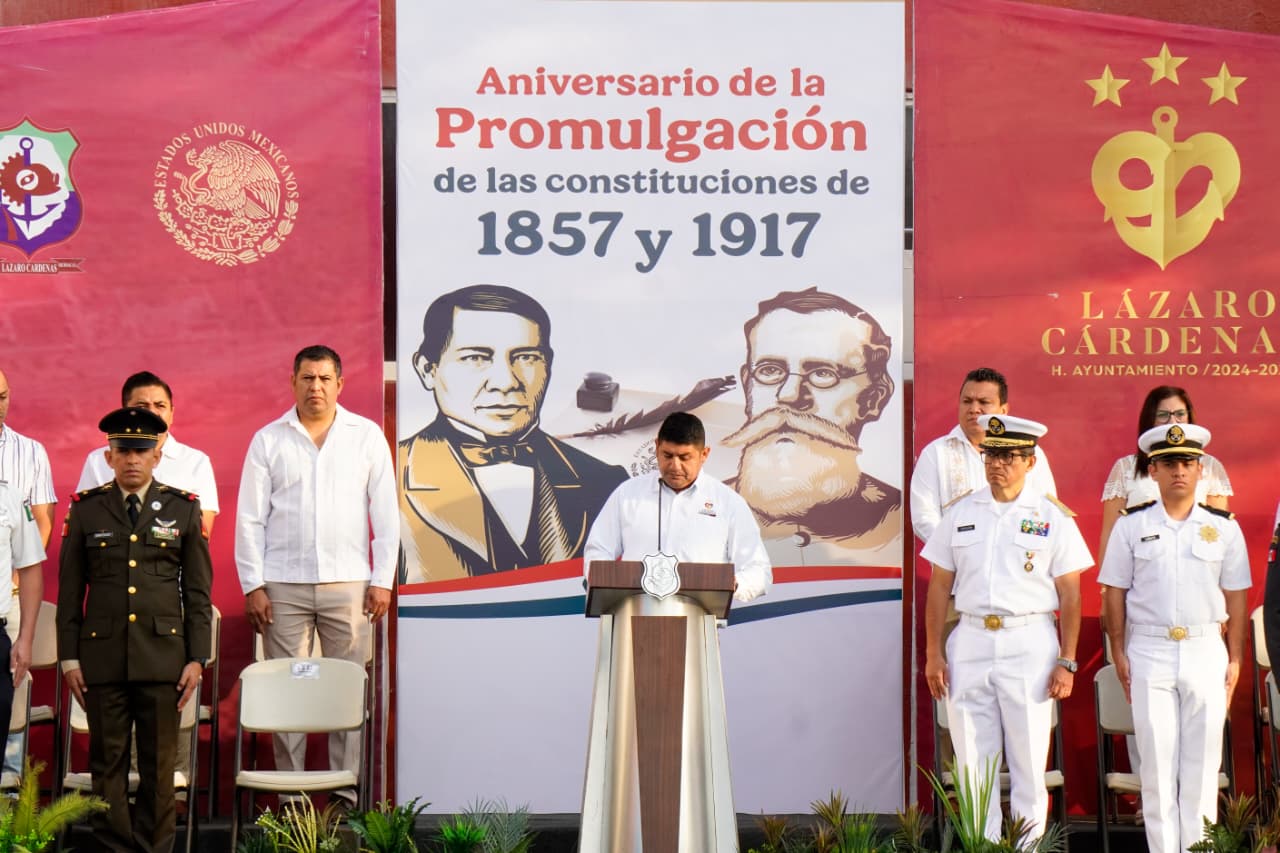 Cd. Lázaro Cárdenas, Mich., a 05 de febrero de 2026.- Con un acto cívico, autoridades militares, civiles y municipales conmemoraron el aniversario de la promulgación de las Constituciones de 1857 y 1917, donde se recordó la relevancia histórica y social de este documento para la vida democrática del país.