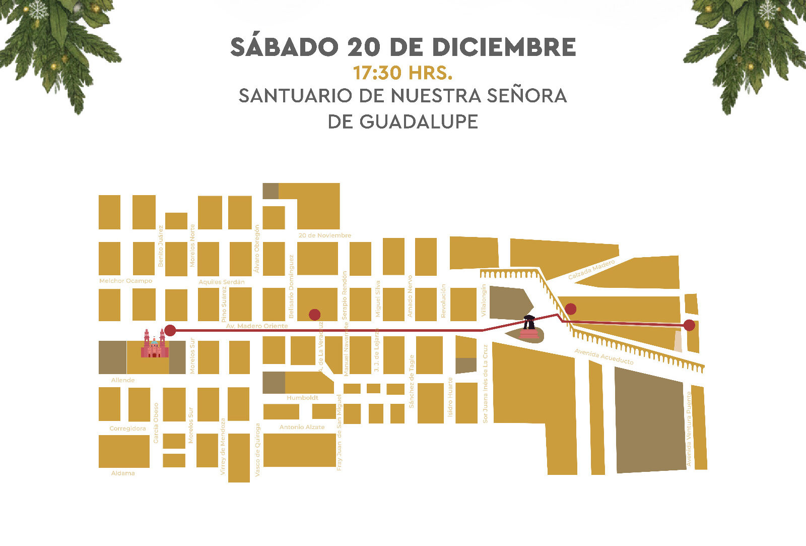 La posada dará inicio a las 17:30 horas en el Santuario de Nuestra Señora de Guadalupe. El recorrido incluirá paradas en los templos de Lourdes y Las Monjas, para culminar en la Catedral de Morelia con la tradicional petición de posada, un concierto navideño, el encendido especial de la Catedral y una verbena popular con antojitos mexicanos.