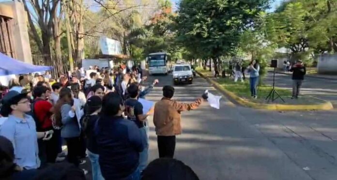 Lanzando consignas en contra de los gobiernos del estado y federal, así como exigiendo justicia para Carlos Manzo, los manifestantes recorrieron varias calles para regresar a las preparatorias dependientes de la Universidad Michoacana, donde permanecen en plantón, al igual que en la facultad de Agrobiología.