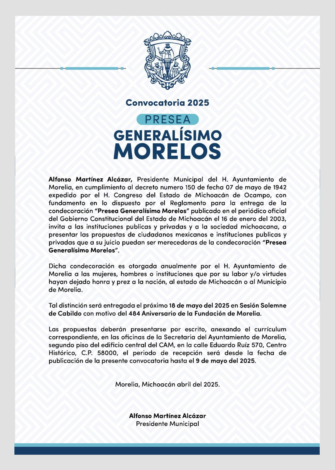 Morelia, Michoacán; 22 de abril de 2025.- El Gobierno de Morelia encabezado por el presidente municipal, Alfonso Martínez Alcázar, invita a la sociedad a participar en la convocatoria a la Presea Generalísimo Morelos 2025, que busca reconocer a morelianas y morelianos por su valiosa aportación a nuestra ciudad, estado y nación.