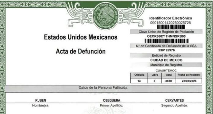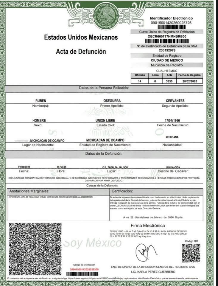 Morelia, Mich. | Redacción.- El acta de defunción número 3830, emitida por el Registro Civil de la Ciudad de México, publicó los pormenores del fallecimiento de Rubén Oseguera Cervantes, “El Mencho”, exlíder del Cártel Jalisco Nueva Generación (CJNG), abatido el 22 de febrero de 2026 durante un operativo federal en Tapalpa, Jalisco.