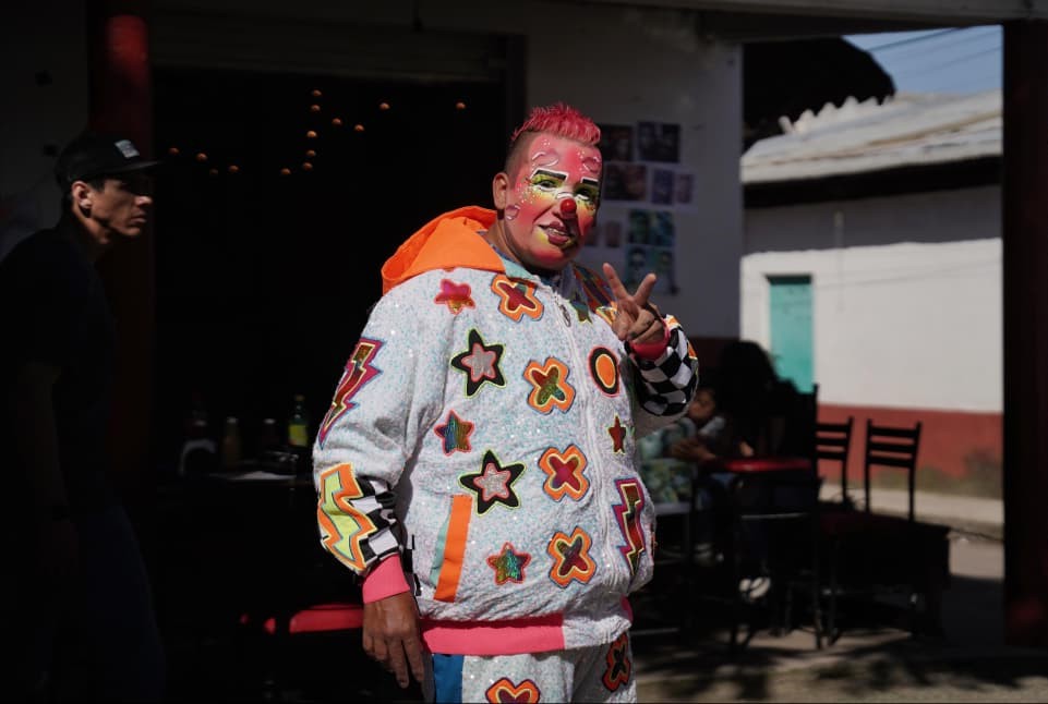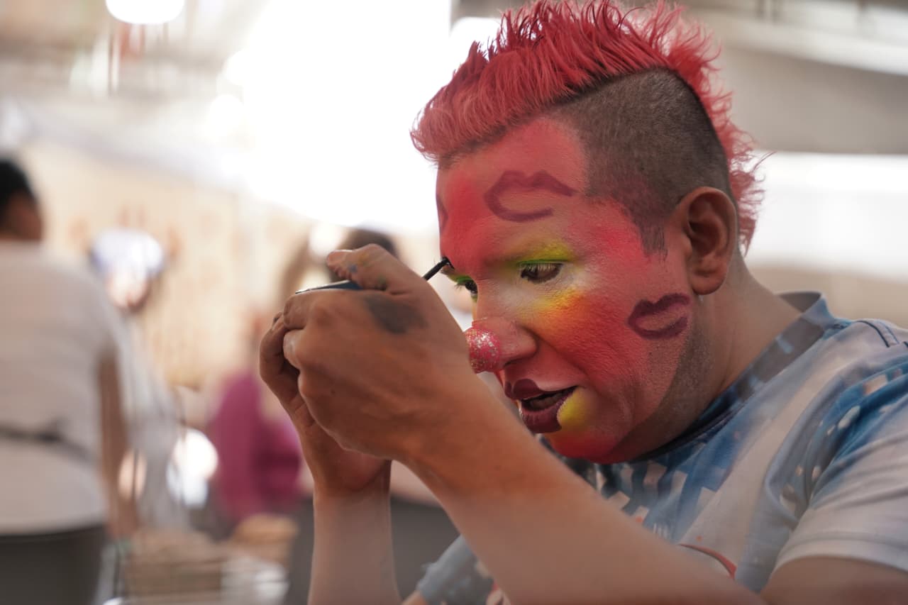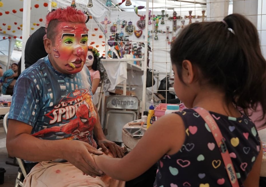 Capula, Morelia, Mich..- Entre el olor a pan de muerto, los colores del barro y el murmullo de los visitantes, aparece una voz conocida: “¡Mi rey, mi reina, mi campeón!”. Detrás del maquillaje fosforescente y el moicano rosa está Pedro Castillo, mejor conocido en la tenencia moreliana como Chocolatín, un payaso que desde hace quince años forma parte del alma de la feria.