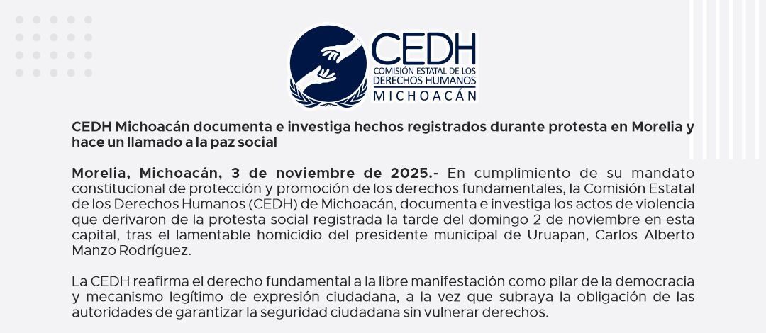 Morelia, Michoacán.- En cumplimiento de su mandato constitucional de protección y promoción de los derechos fundamentales, la Comisión Estatal de los Derechos Humanos (CEDH) de Michoacán, documenta e investiga los actos de violencia que derivaron de la protesta social registrada la tarde del domingo 2 de noviembre en esta capital, tras el lamentable homicidio del presidente municipal de Uruapan, Carlos Alberto Manzo Rodríguez.