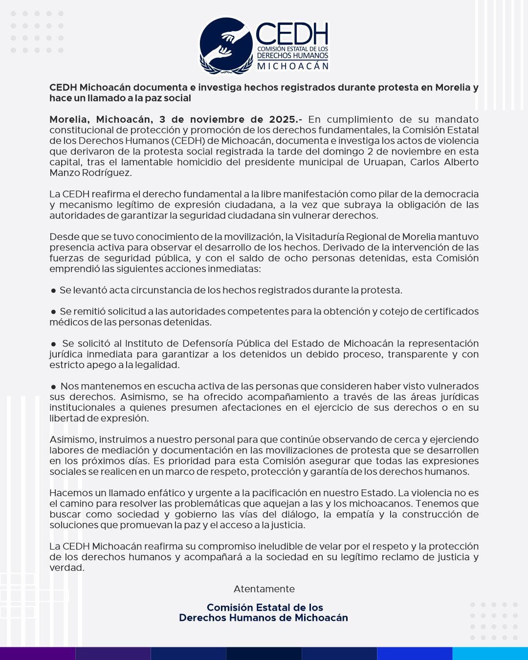 La CEDH Michoacán reafirma su compromiso ineludible de velar por el respeto y la protección de los derechos humanos y acompañará a la sociedad en su legítimo reclamo de justicia y verdad.