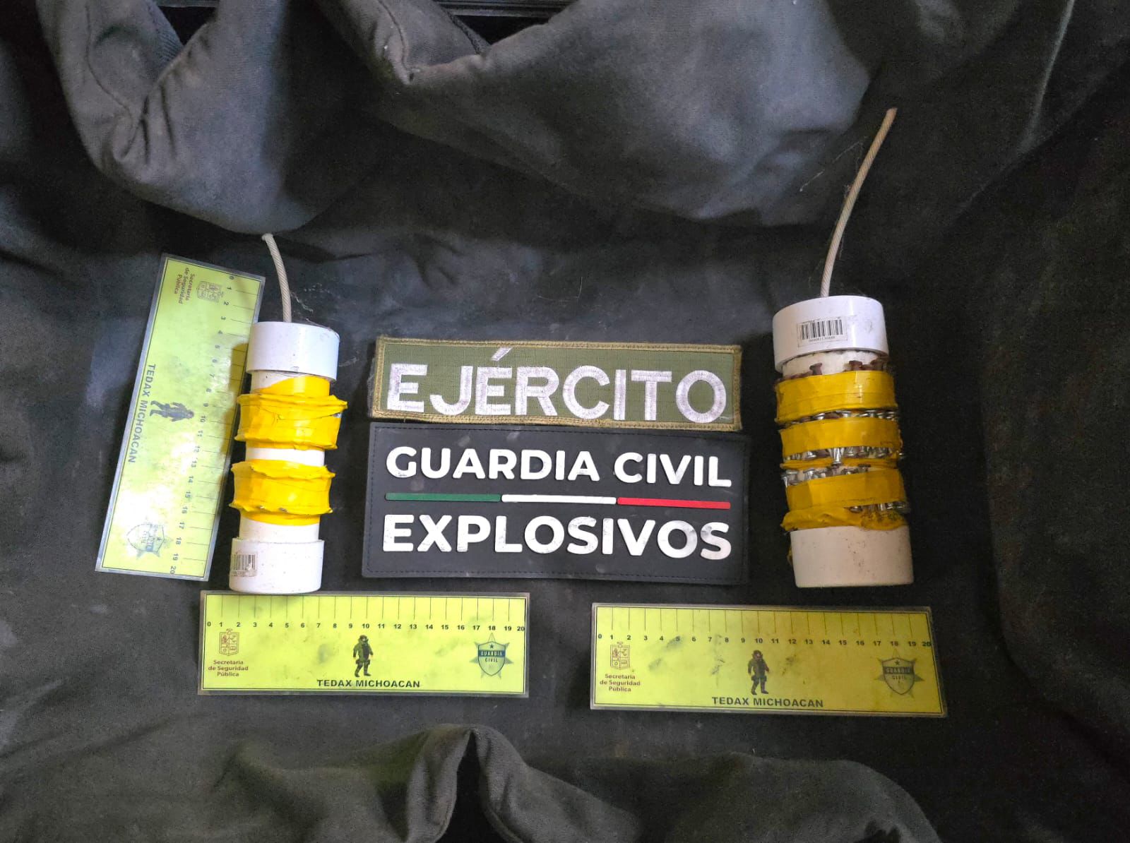 También durante tareas interinstitucionales coordinadas en el poblado de Pedernales, municipio de Tacámbaro, se aseguraron dos granadas de mano hechizas, elaboradas con tubos de PVC y pólvora aluminizada en su carga explosiva, con mecha y metralla con clavos de acero para concreto adheridos a los artefactos.