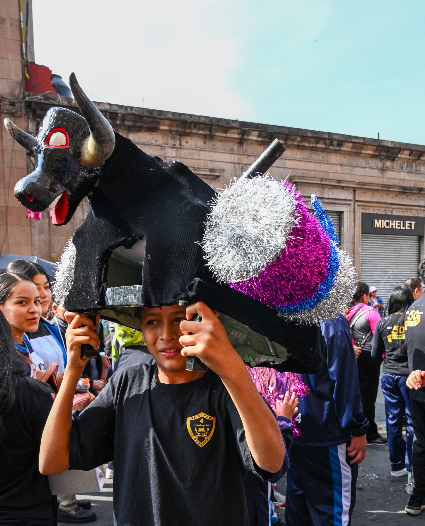 El recorrido estuvo acompañado por la música de una banda, el ritmo de la banda de guerra y la presencia de un torito de petate que animó el trayecto.