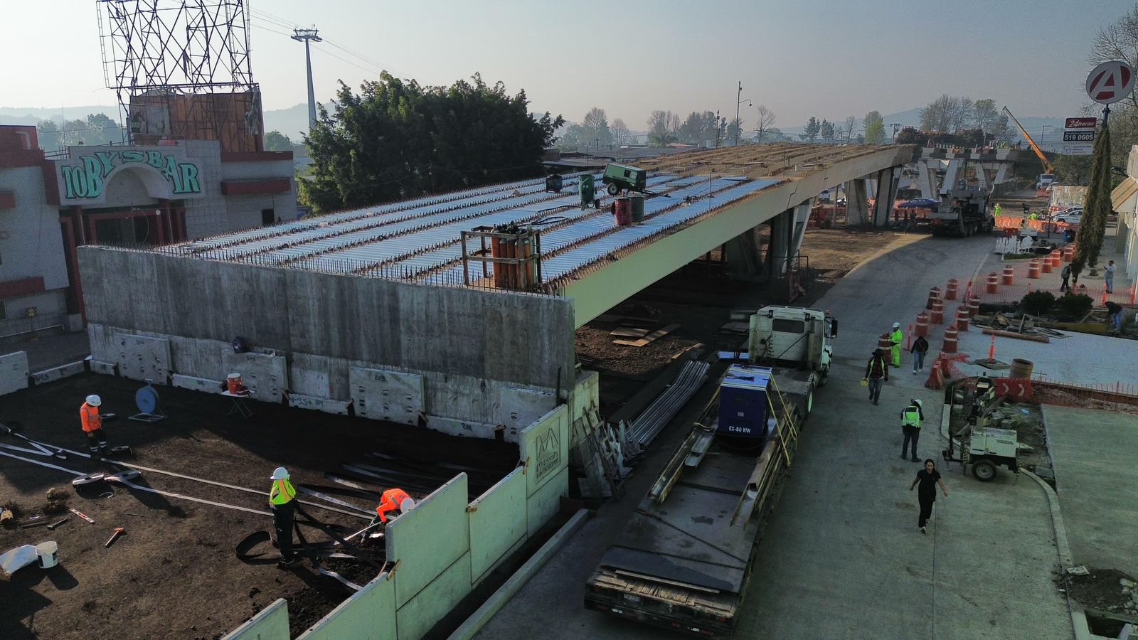 Zarazúa Sánchez detalló que la obra cuenta con 150 trabajadores en sitio, distribuidos en tres turnos. Las labores actuales incluyen la colocación de ductería de media tensión, la nivelación y compactación de rellenos a nivel de subrasante, y la instalación de muros mecánicamente estabilizados en armados de losa. En cuanto a la estructura principal, se lleva a cabo el montaje nocturno de 24 de las 36 trabes metálicas totales, una medida implementada para disminuir la afectación vial en la zona.