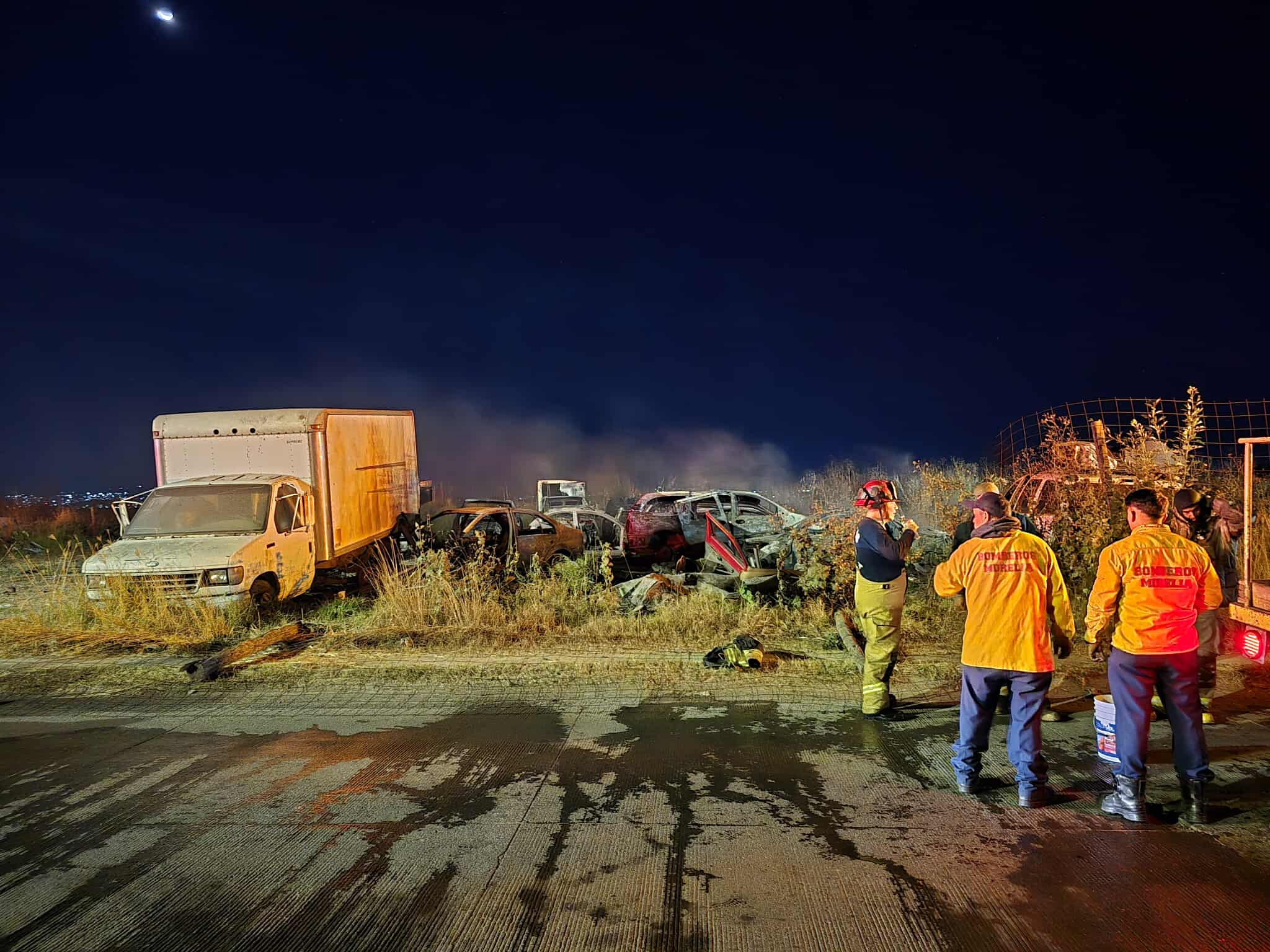 Morelia, Mich.- Jueves 25 de diciembre de 2025.- Un incendio en un deshuesadero de vehículos se registró la noche de este jueves al norte de la ciudad de Morelia, indicaron fuentes de rescate, las cuales agregaron que al menos cuatro automotores viejos resultaron afectados.