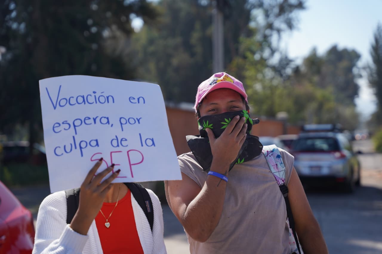 Los manifestantes exigen una mesa de diálogo para dar seguimiento a la asignación de plazas, luego de que señalaron, que únicamente se realizó un primer evento en octubre pasado, en el que se otorgaron 48 plazas, situación que mantiene en rezago a generaciones que van de 2020 a 2025.