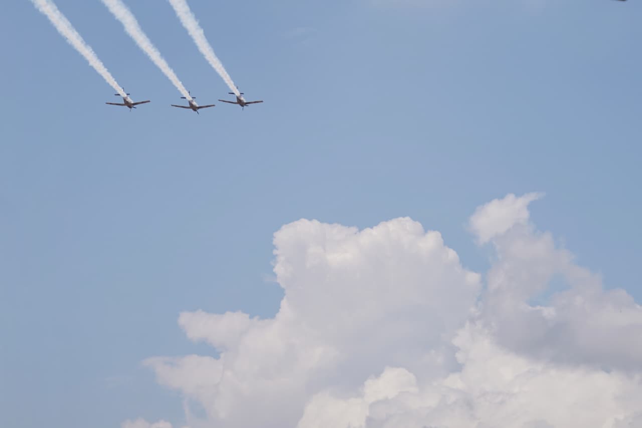 Uno de los momentos más esperados se vivió en el cielo, cuando aeronaves de la Fuerza Aérea Mexicana realizaron maniobras que dejaron huella en el aire, arrancando aplausos y miradas de asombro entre los asistentes. El rugido de los motores acompañó el eco de tambores y cornetas, reforzando la solemnidad del homenaje al Siervo de la Nación.