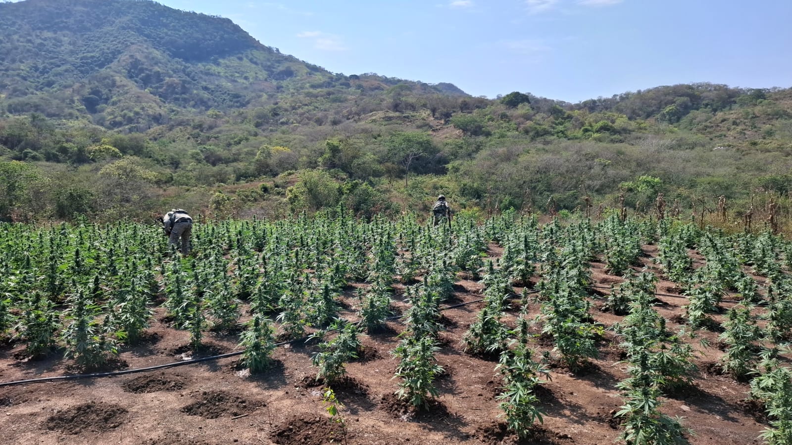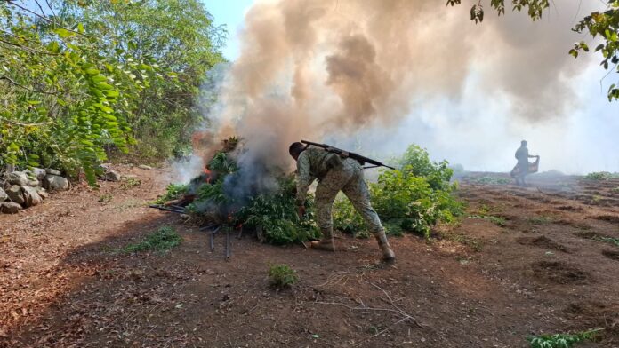 De manera paralela, en zonas serranas del municipio, los militares detectaron un plantío de marihuana con una extensión aproximada de 600 metros cuadrados, con una densidad de siete plantas por metro cuadrado, lo que equivale a cerca de 4 mil 200 plantas con una altura promedio de 40 centímetros. En el mismo sector fueron localizados dos campamentos presuntamente utilizados por grupos delictivos.