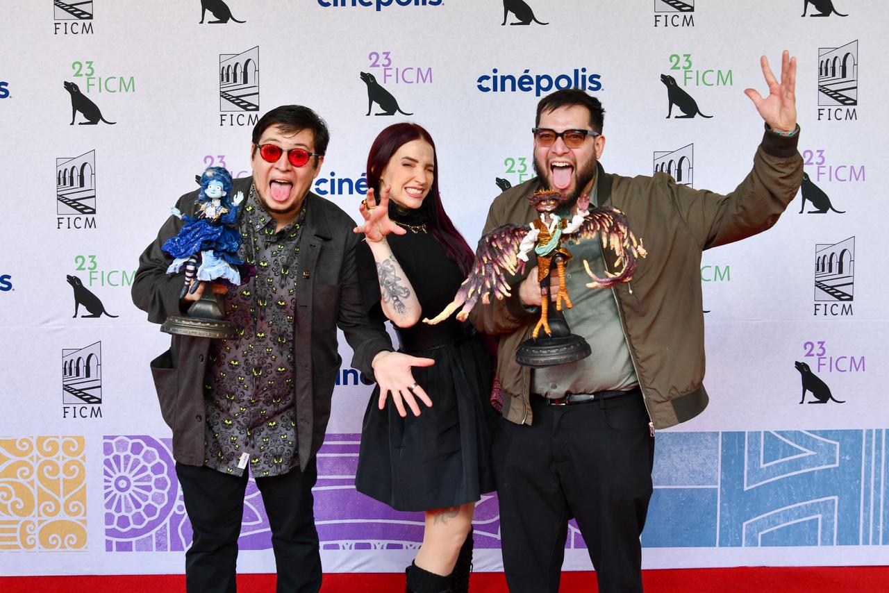 Morelia, Mich. | Agencia ACG.- Los directores Arturo y Roy Ambriz, junto a Mireya Mendoza, voz de Frankelda, desfilaron por la alfombra roja de “Soy Frankelda” en el Teatro Mariano Matamoros, dentro del 23º Festival Internacional de Cine de Morelia. Durante la presentación, los realizadores anunciaron que la cinta será proyectada en Pixar, en San Francisco, y en el festival Animation Is Film de Los Ángeles, además de compartir que a la película final se le quitaron 15 minutos y se añadieron 7 más con la asistencia de Guillermo del Toro.