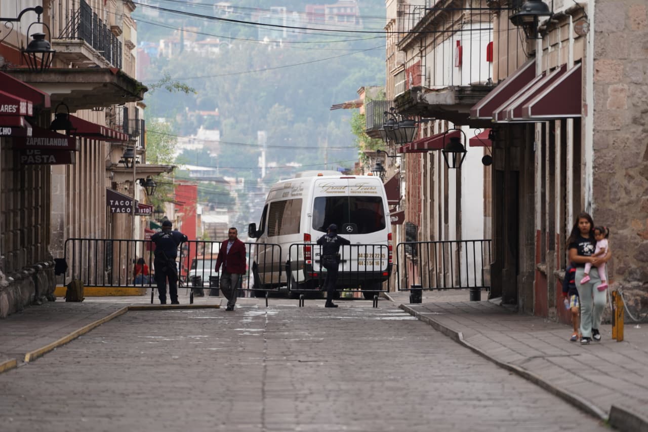 El primer cuadro de Morelia amaneció rodeado por más vallas perimetrales que regulan los accesos, además de filtros de seguridad donde elementos de la Guardia Civil revisan a los asistentes con detectores metálicos y escáneres para impedir el ingreso de armas u objetos no permitidos.
