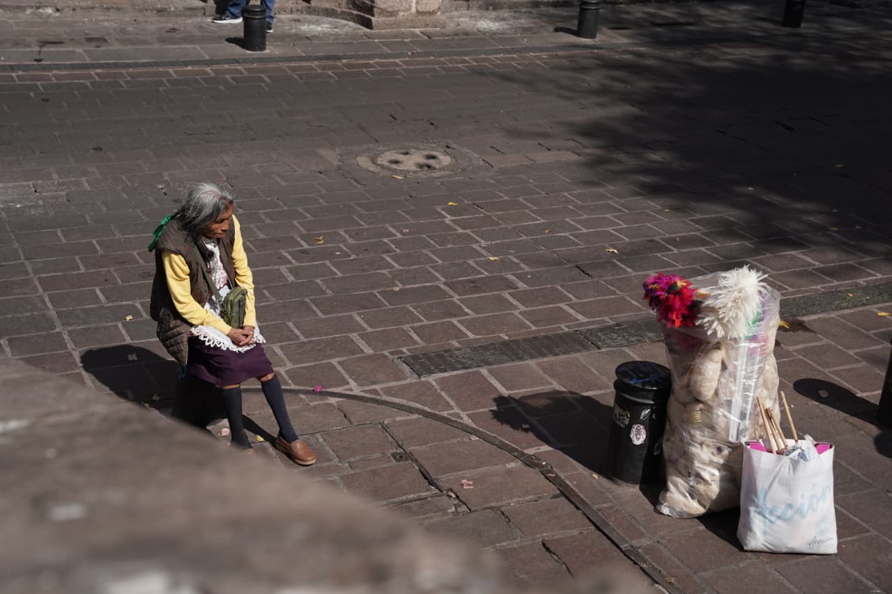Morelia, Michoacán | Redacción ACG.- Al final de la calle El Nigromante, frente al Templo de las Rosas, una mujer de la tercera edad se sienta domingo a domingo a ofrecer un oficio casi olvidado en Morelia: la venta de plumeros y estropajos.