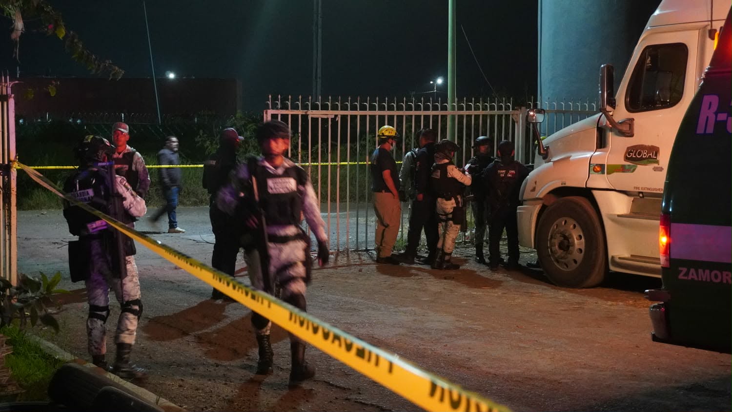 Policías Municipales, Guardias Nacionales y Guardias Civiles acudieron para atender el reporte y sobre la banqueta a un costado de la reja de acceso al Fraccionamiento encontraron a un afectado tirado con heridas de bala.