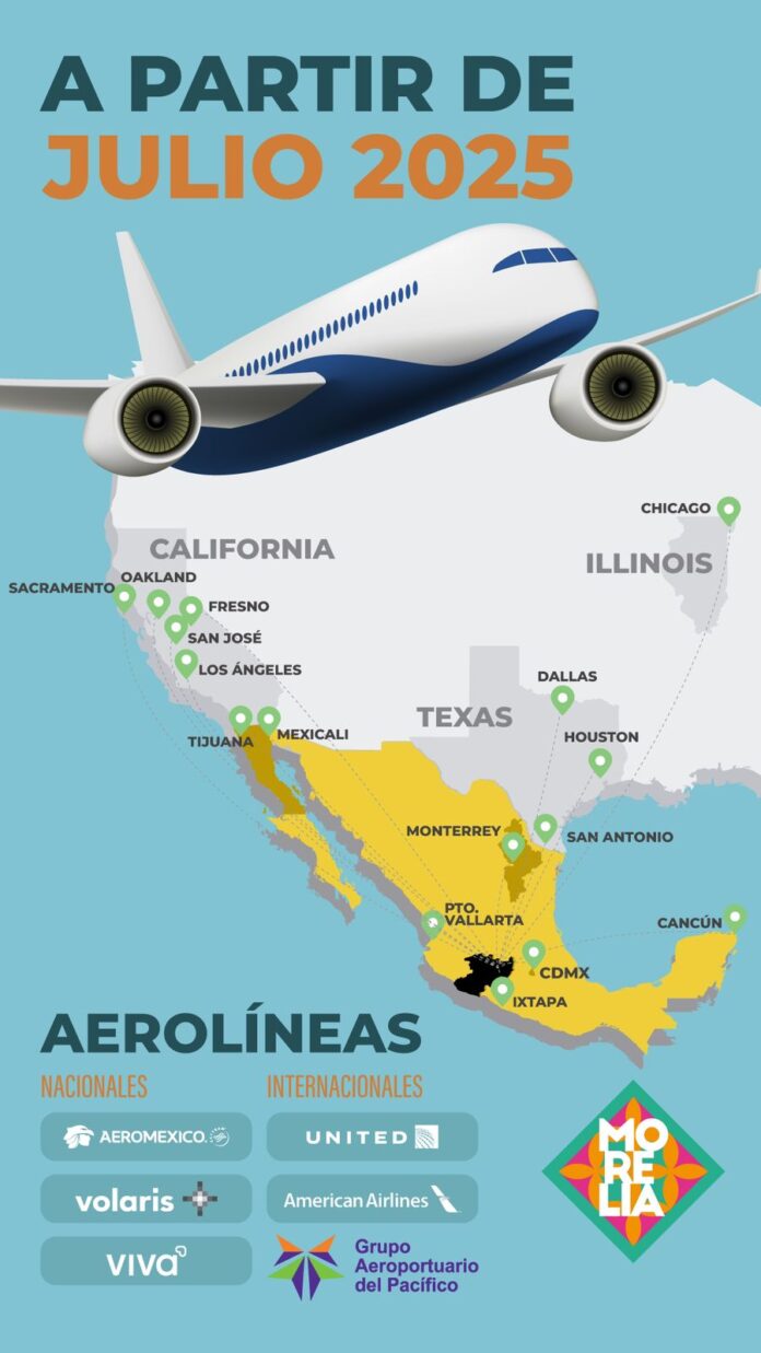 En el plano internacional, la capital michoacana goza el enlace aéreo con: Chicago, San Antonio, Los Ángeles, Ontario, San José, Fresno, Oakland, Sacramento, Houston y Dallas.