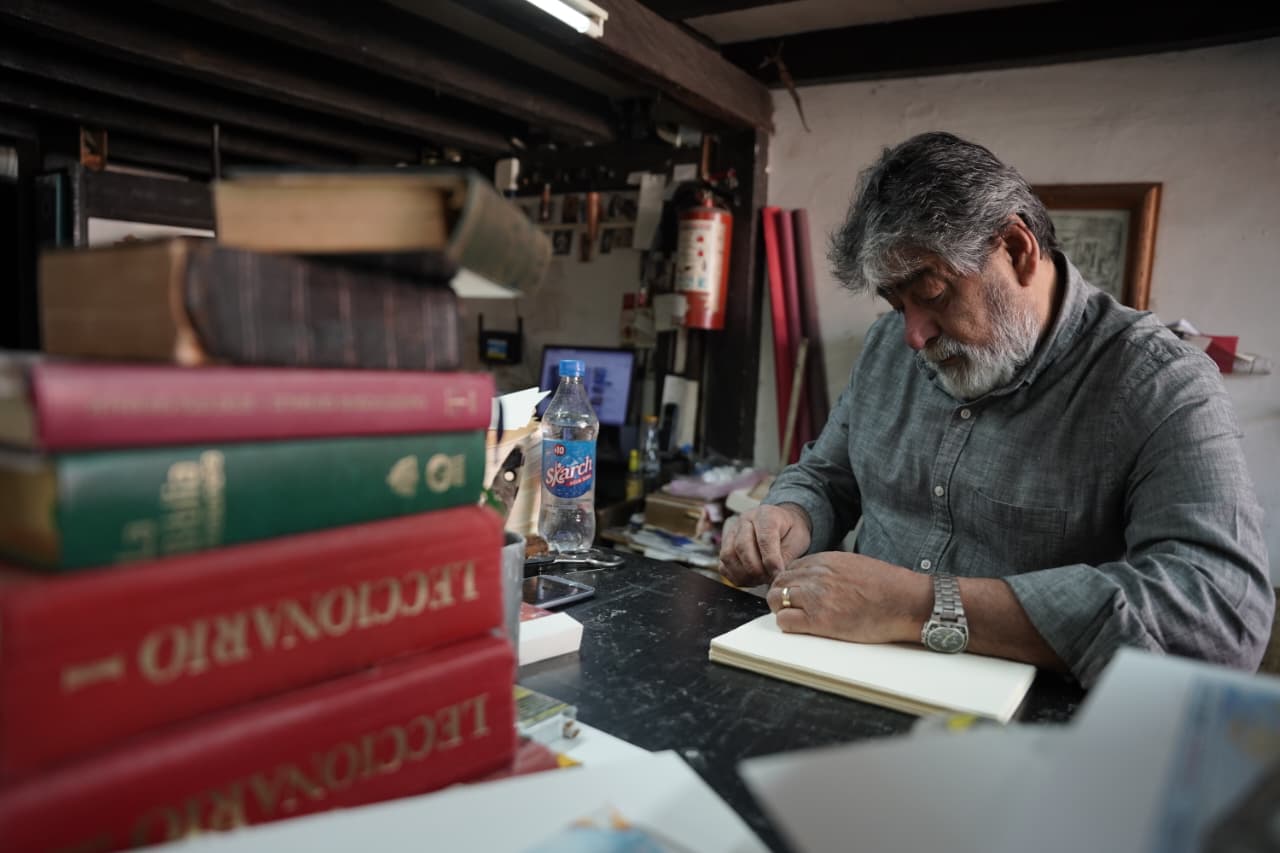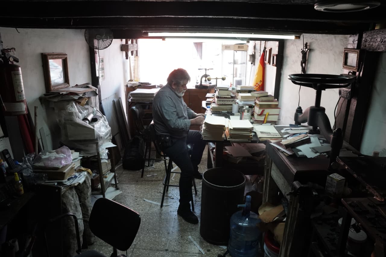 En la pared, Manuel guarda una prensa con siglos encima; dice que hasta extranjeros se la han querido comprar, pero fue con ella que inició el oficio heredado de su familia. También hay pilas de papeles de texturas diversas, recortes de piel curtida, tipos metálicos y libros abiertos, detenidos en distintas etapas del proceso.