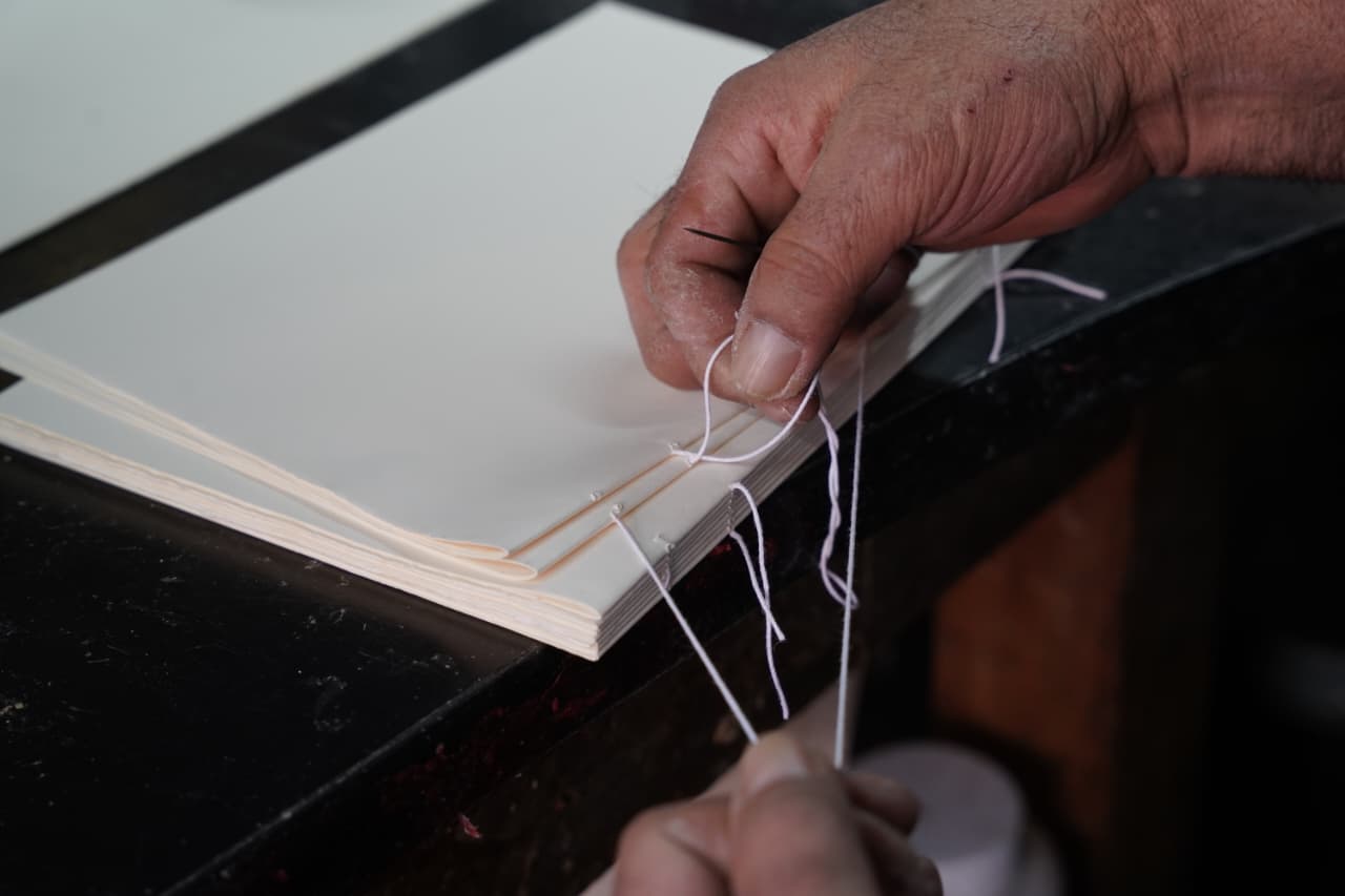«Mis técnicas de encuadernación son iguales que hace 500 años. Mis nietos van a morir de viejos, Dios quiera, y mis libros encuadernados ahí van a seguir», dice Manuel Sánchez Magaña, mientras aprieta las costuras recién hechas del lomo de un libro.