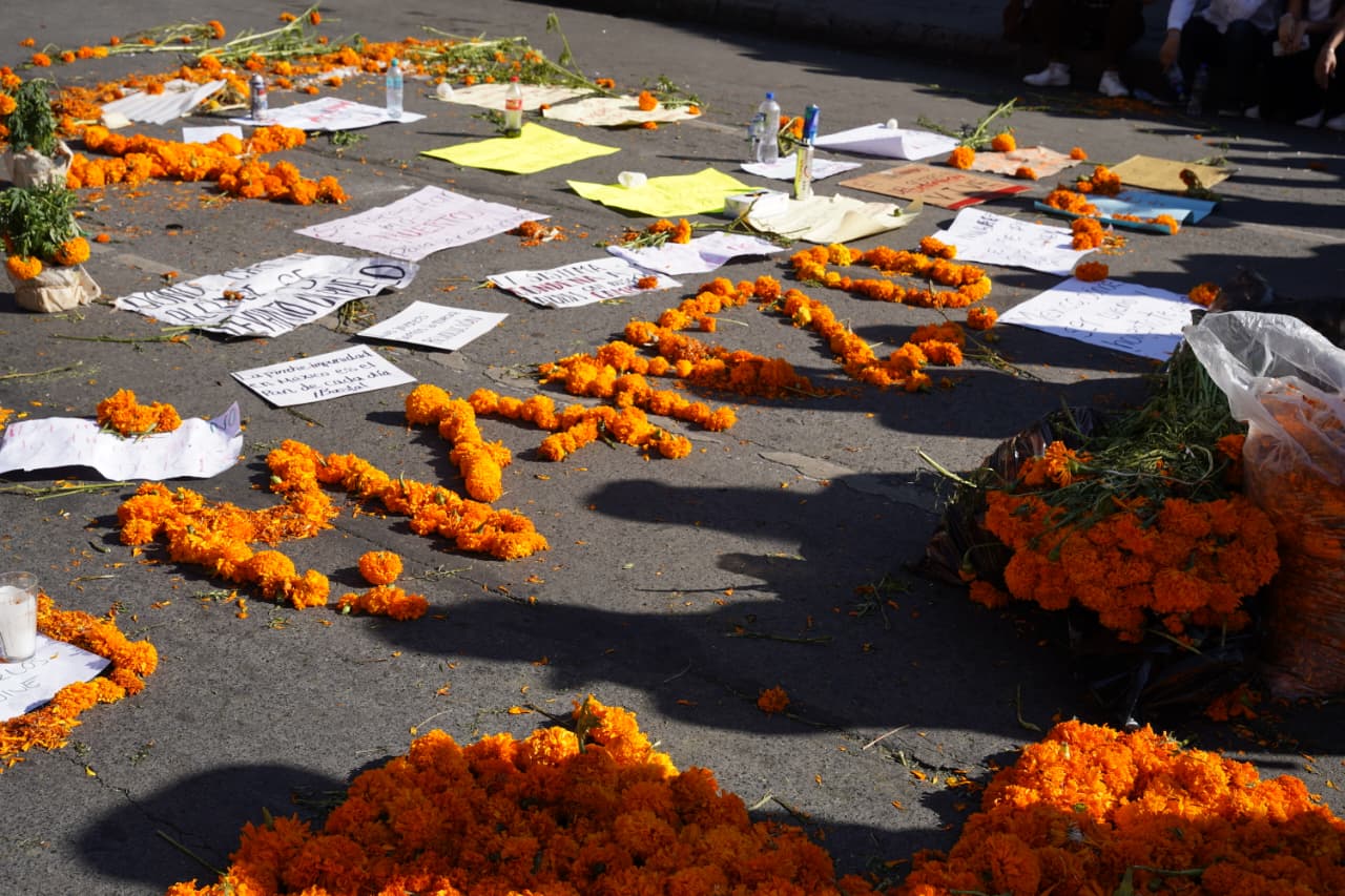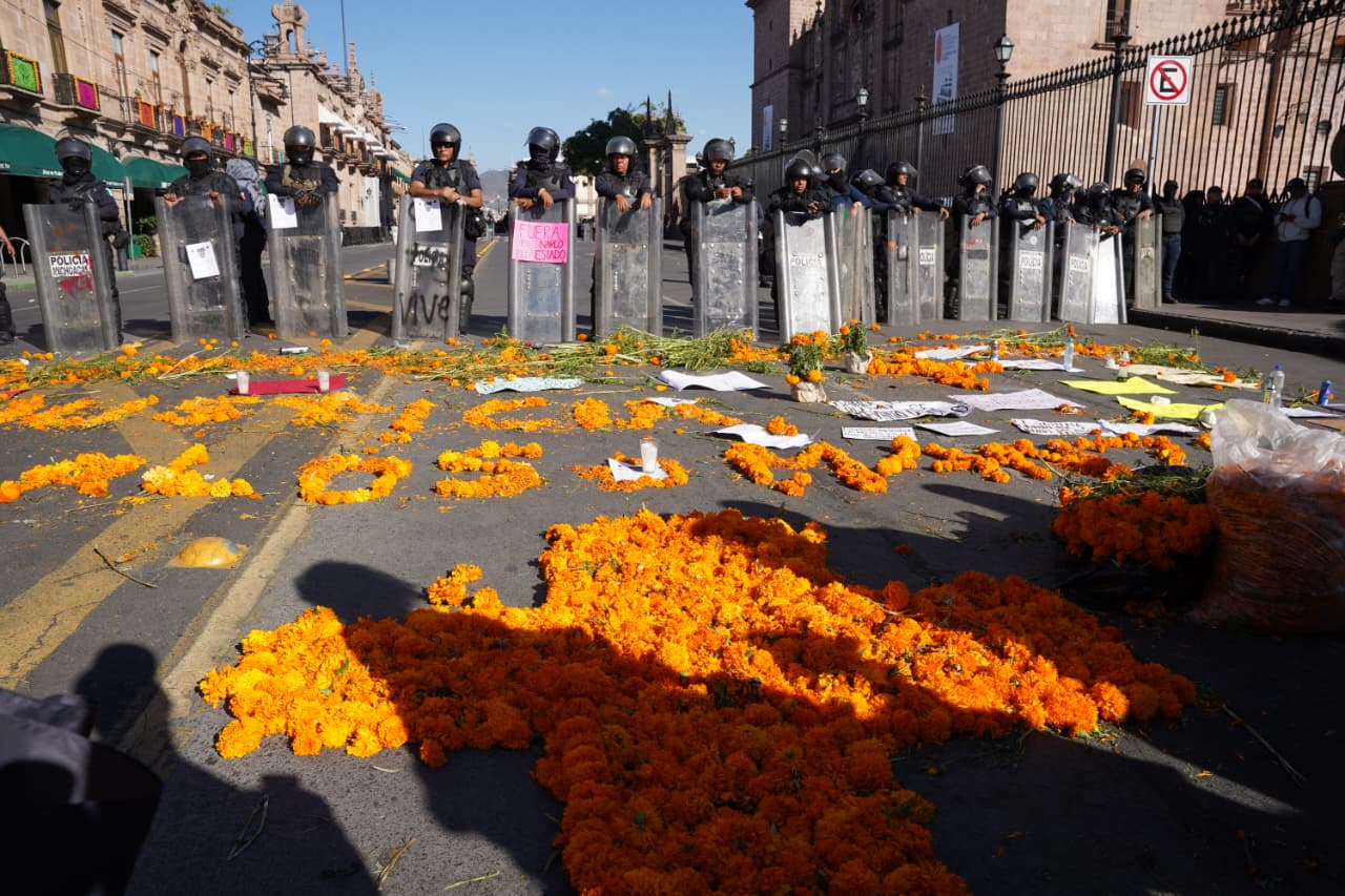 Morelia, Michoacán | Redacción ACG.- En un acto simbólico y de protesta pacífica, estudiantes colocaron flores de cempasúchil y carteles sobre el suelo, frente a la muralla formada por granaderos, en memoria de Carlos Manzo, presidente municipal de Uruapan asesinado recientemente, y de Alejandro Correa Gómez, reportado como desaparecido desde el pasado 2 de noviembre.