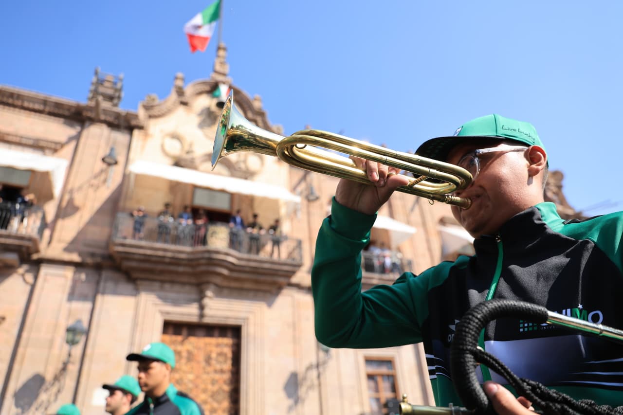 La energía de las y los jóvenes fue la protagonista del desfile conmemorativo, ya que con sus coloridos uniformes, tablas rítmicas y demostraciones deportivas lucieron a lo largo del centro histórico, desde el Acueducto hasta la Catedral de Morelia.