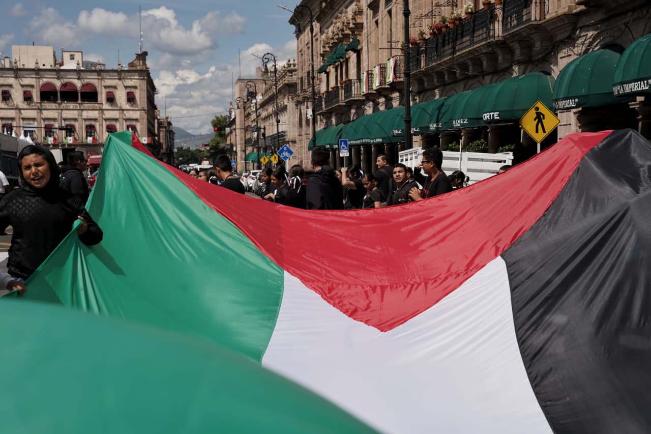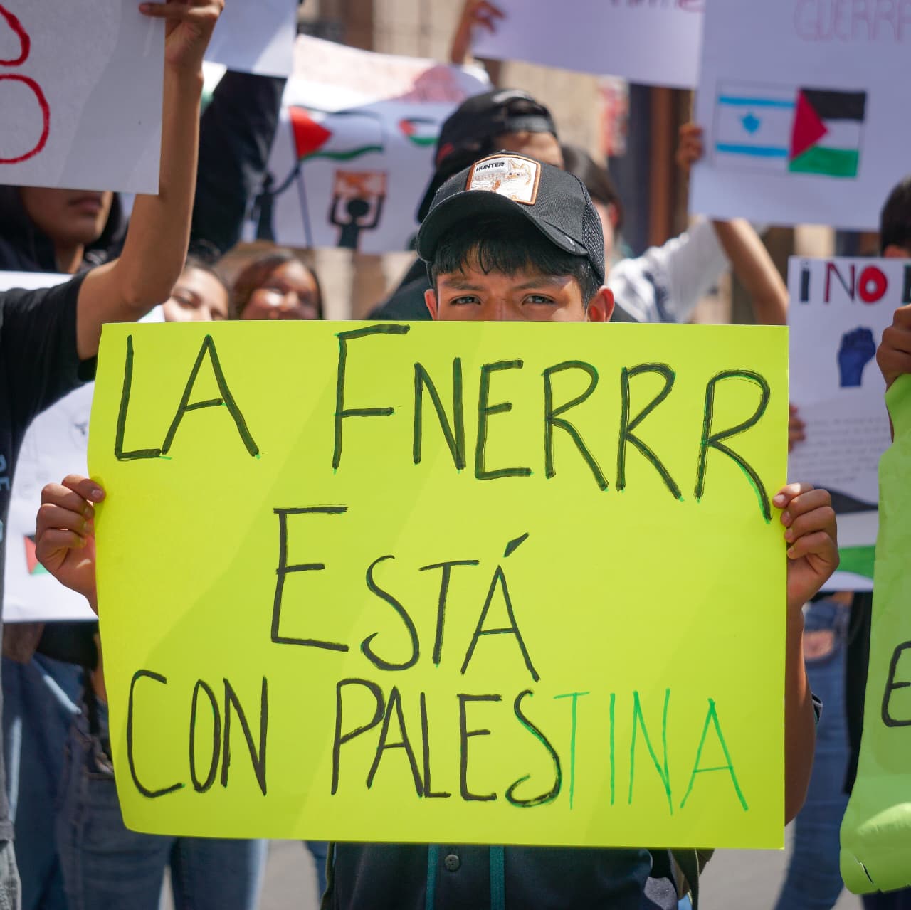Pidiendo cese al fuego y la solidaridad con el pueblo palestino, los jóvenes ocuparon parte de la avenida Madero, donde formaron un contingente amplio que avanzó entre tambores y gritos de apoyo.