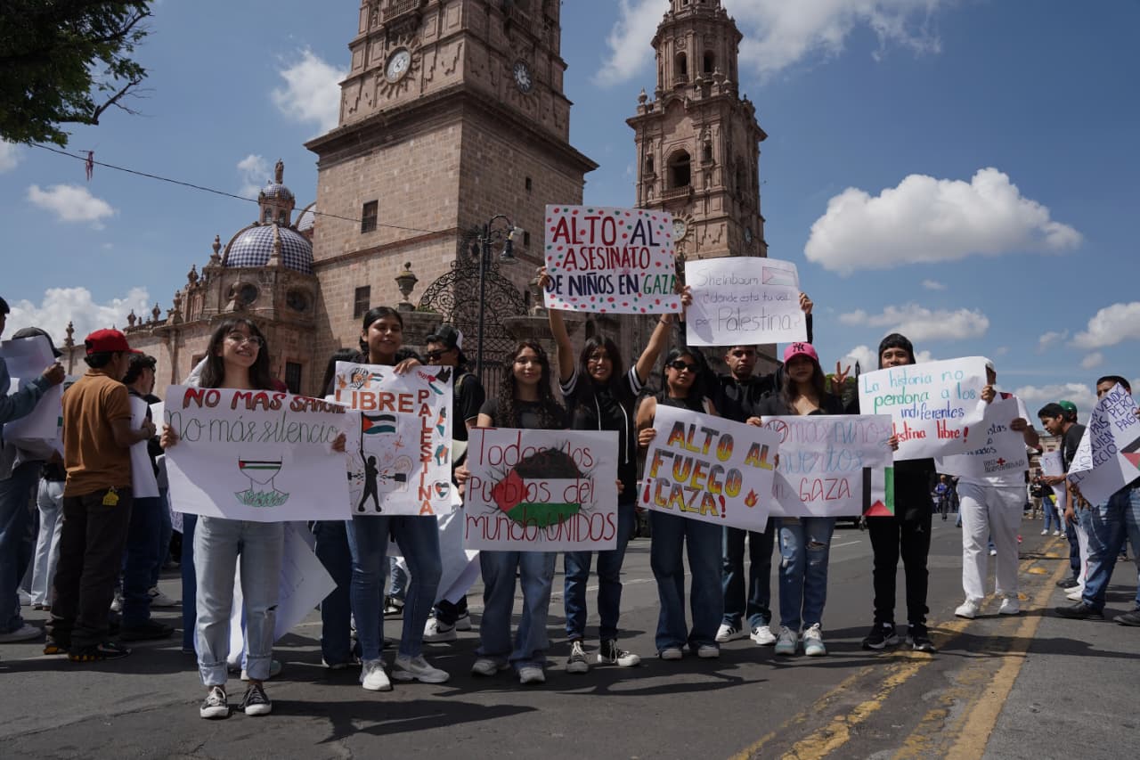 Morelia, Michoacán | Agencia ACG.– Entre consignas, banderas y pancartas con los colores de Palestina, alumnas y alumnos de distintos colegios, bachilleratos y de la Casa del Estudiante se manifestaron esta mañana frente a Palacio de Gobierno.
