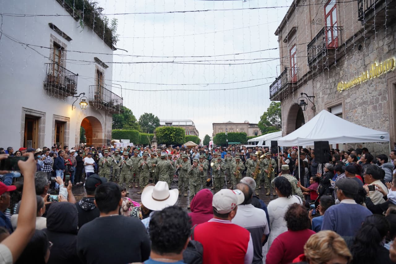 Morelia, Mich..- Con una ligera llovizna que pintaba de gris la tarde en el histórico de Morelia, de pronto llego la Banda de Música de la XII Región Militar (21/a. Zona Militar, Irapuato) para irrumpir la cotidianidad con música.