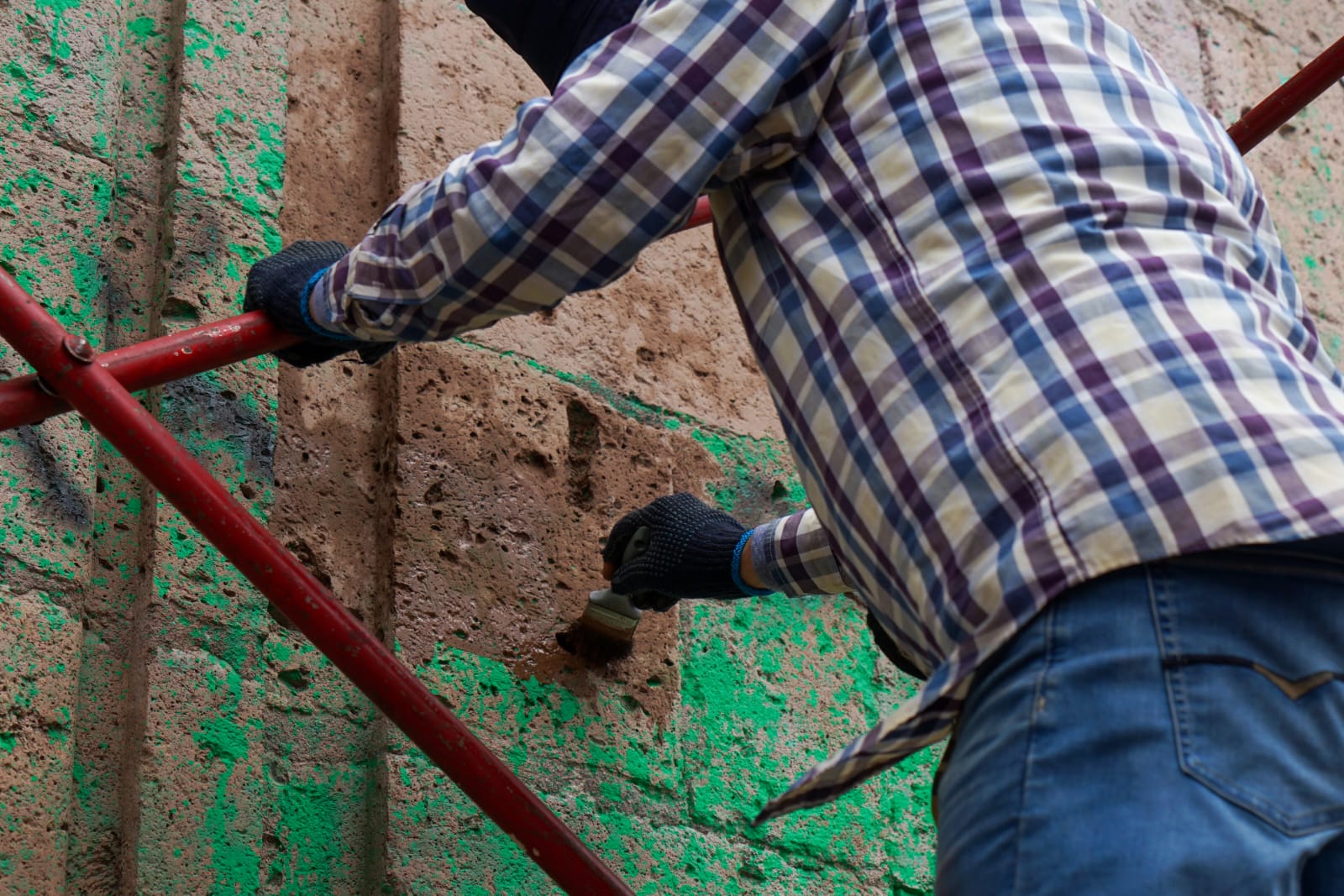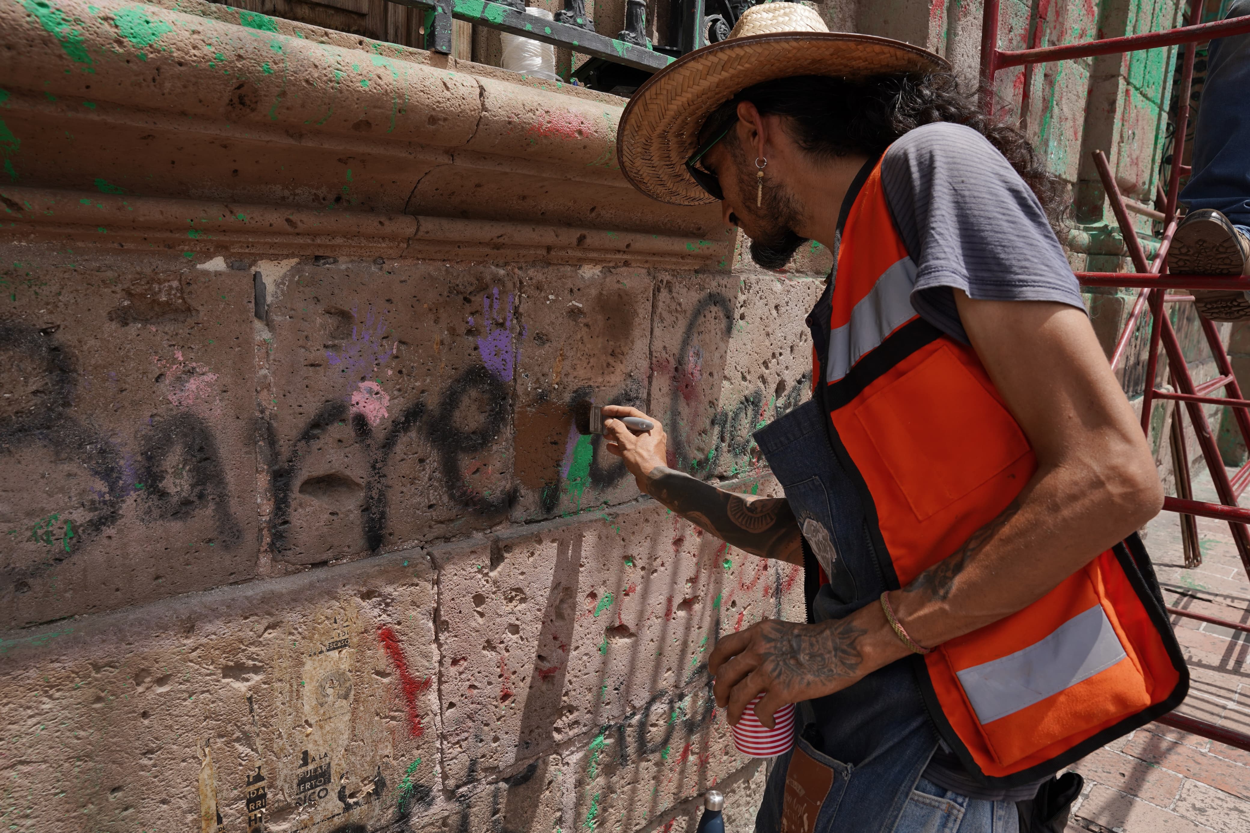Con seis tonos diferentes de pintura, trabajadores especializados en restauración han comenzado a recubrir la fachada del Palacio de Gobierno, con el objetivo de tapar las pintas en el edificio.