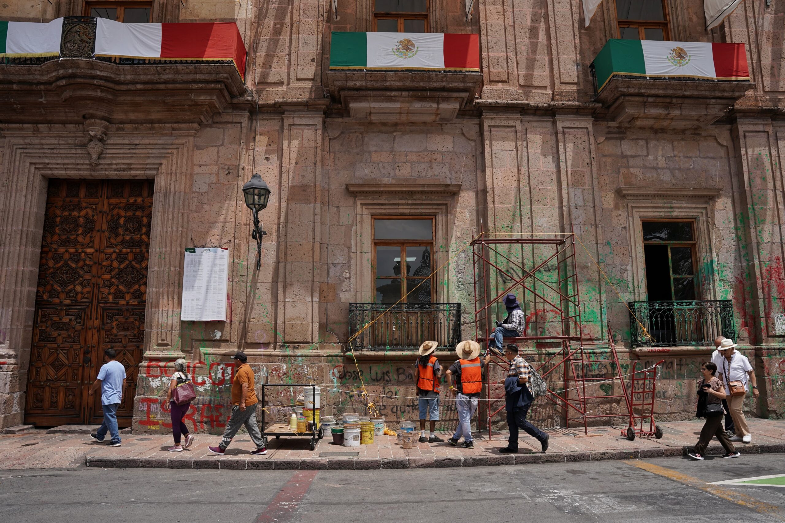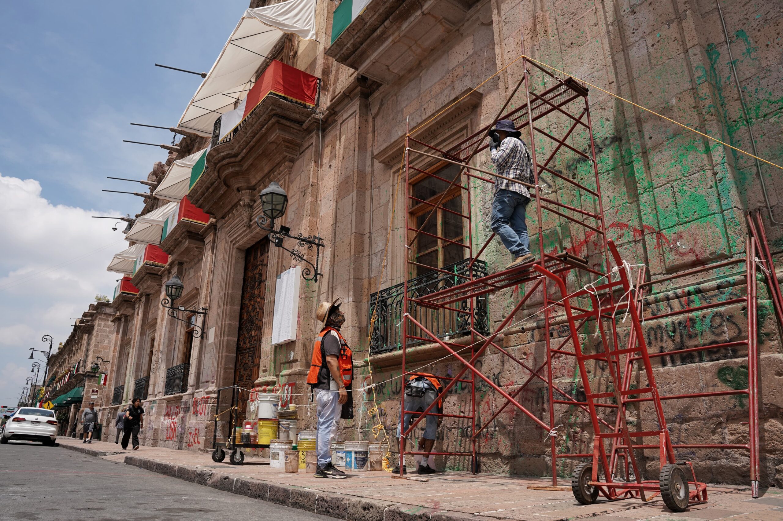 Morelia, Mich. | Acueducto Online.-Ante la llegada del mes patrio y con ello, las celebraciones del Grito de Independencia y los desfiles cívicos-militares, personal trabaja en la limpieza de la fachada de Palacio de Gobierno, que ha sido vandalizada y grafiteada por los grupos que han participado en diversas manifestaciones.