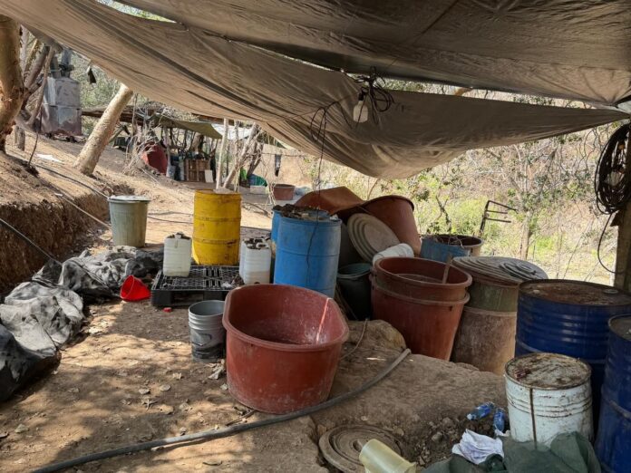 También, se decomisaron 20 tambos de plástico con capacidad de 200 litros, 50 bidones de plástico con combustibles, cuatro tanques de gas LP, 30 cubetas de plástico, nueve tubos acondicionados como enfriadores, cuatro ollas metálicas para calentamiento de sustancias químicas y dos costales de sosa cáustica con un peso de 25 kilos.